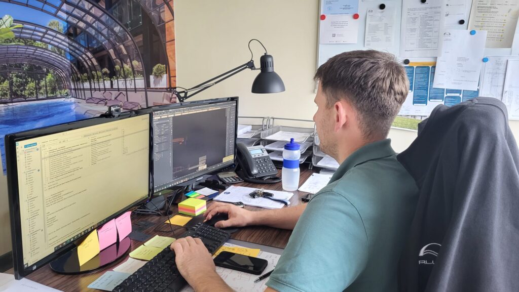 När vi har valt modell och storlek på taket skickar vi dig en detaljerad teknisk ritning som ligger till grund för produktionsdokumentationen. Du kan i lugn och ro analysera den föreslagna lösningen, och om något är oklart eller behöver ändras finns din rådgivare tillgänglig. När du är redo skickar du oss den godkända ritningen – det är för oss signalen att vi kan påbörja produktionen.