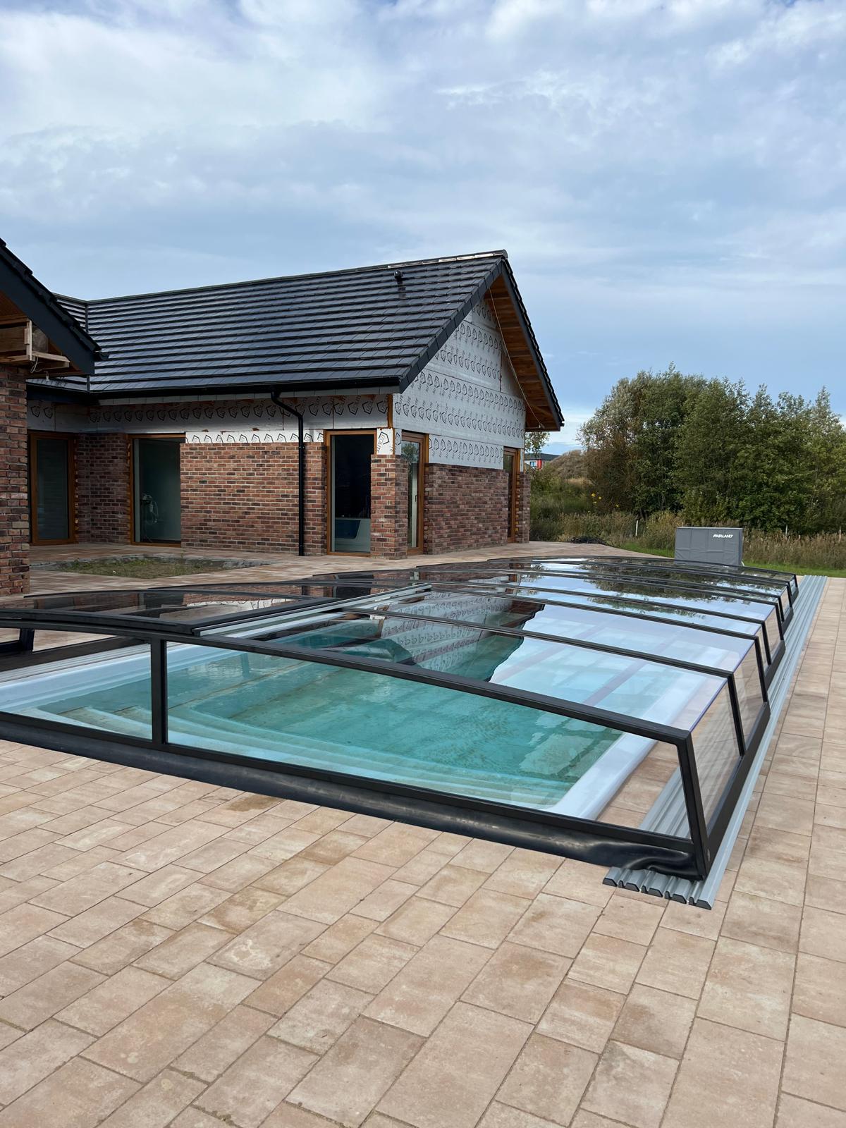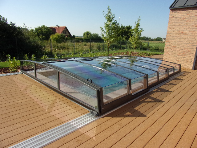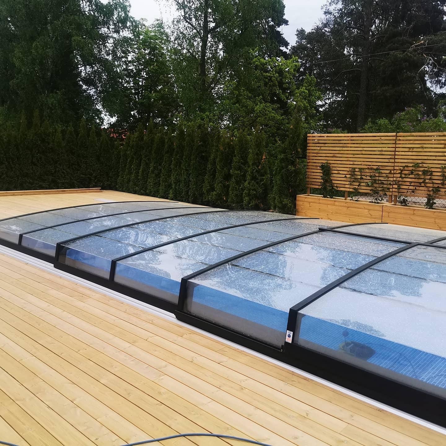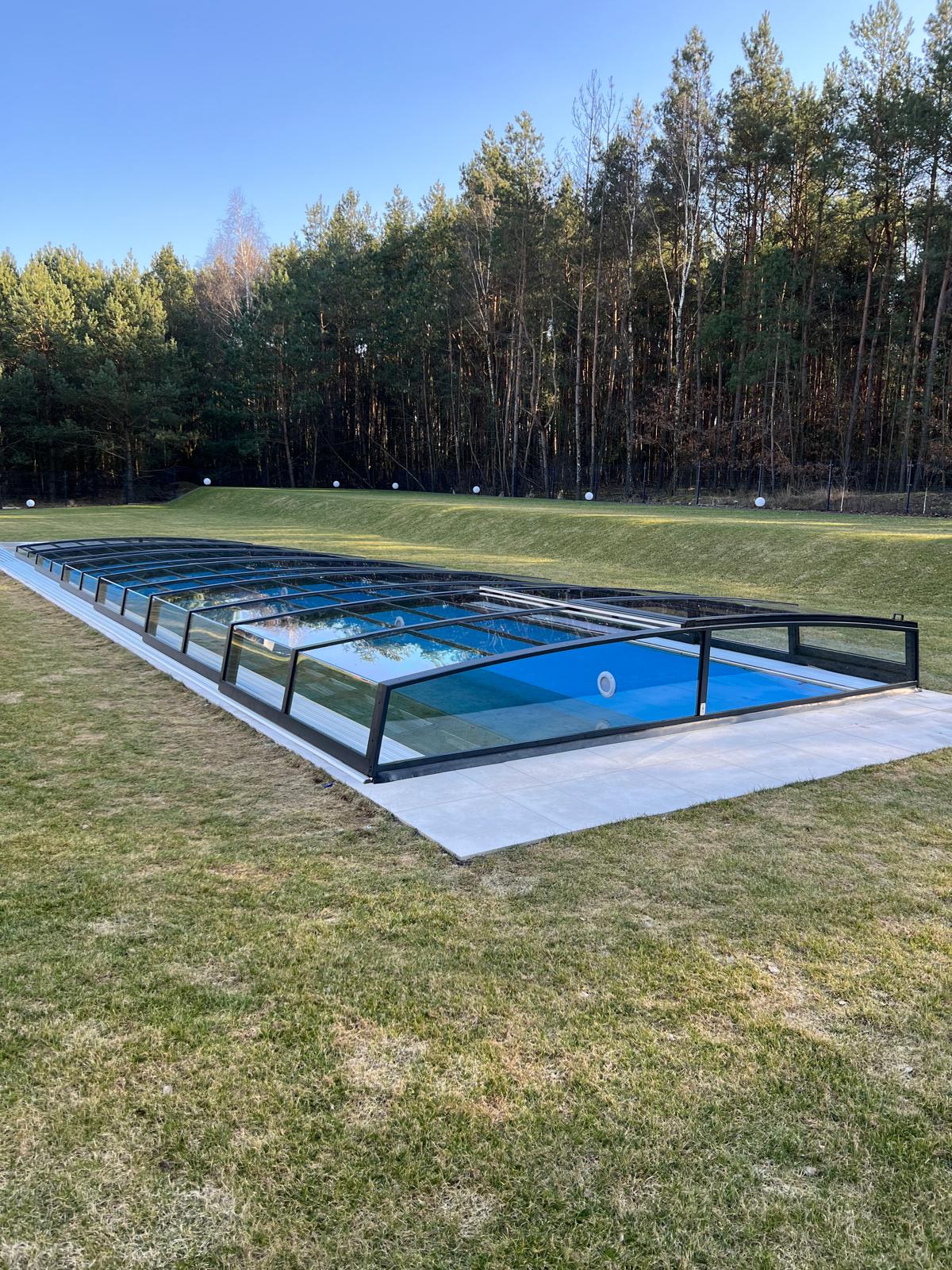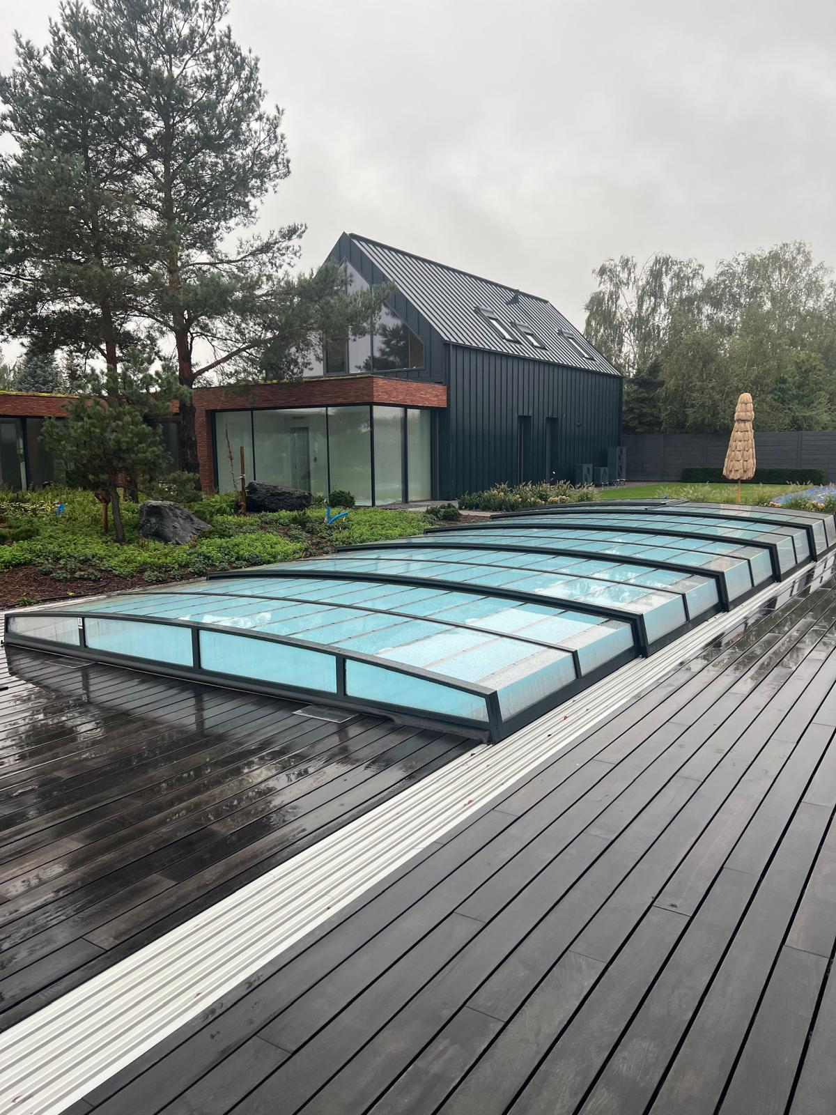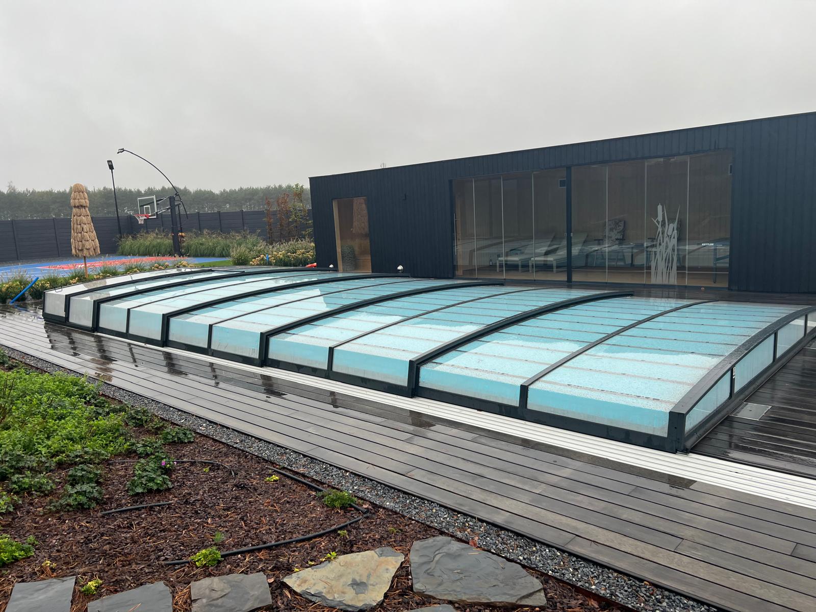 Bågen i den övre delen av konstruktionen leder perfekt bort vatten och liggande snö, vilket gör konstruktionen lätt att underhålla, och höjden på taket ger redan möjlighet till begränsad simning när taket är stängt.