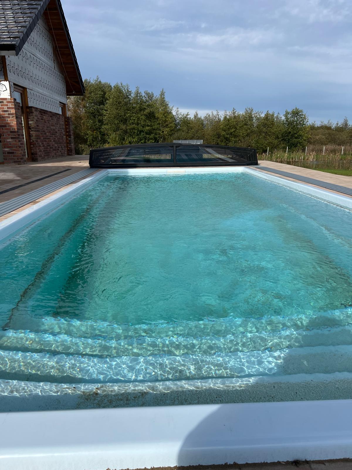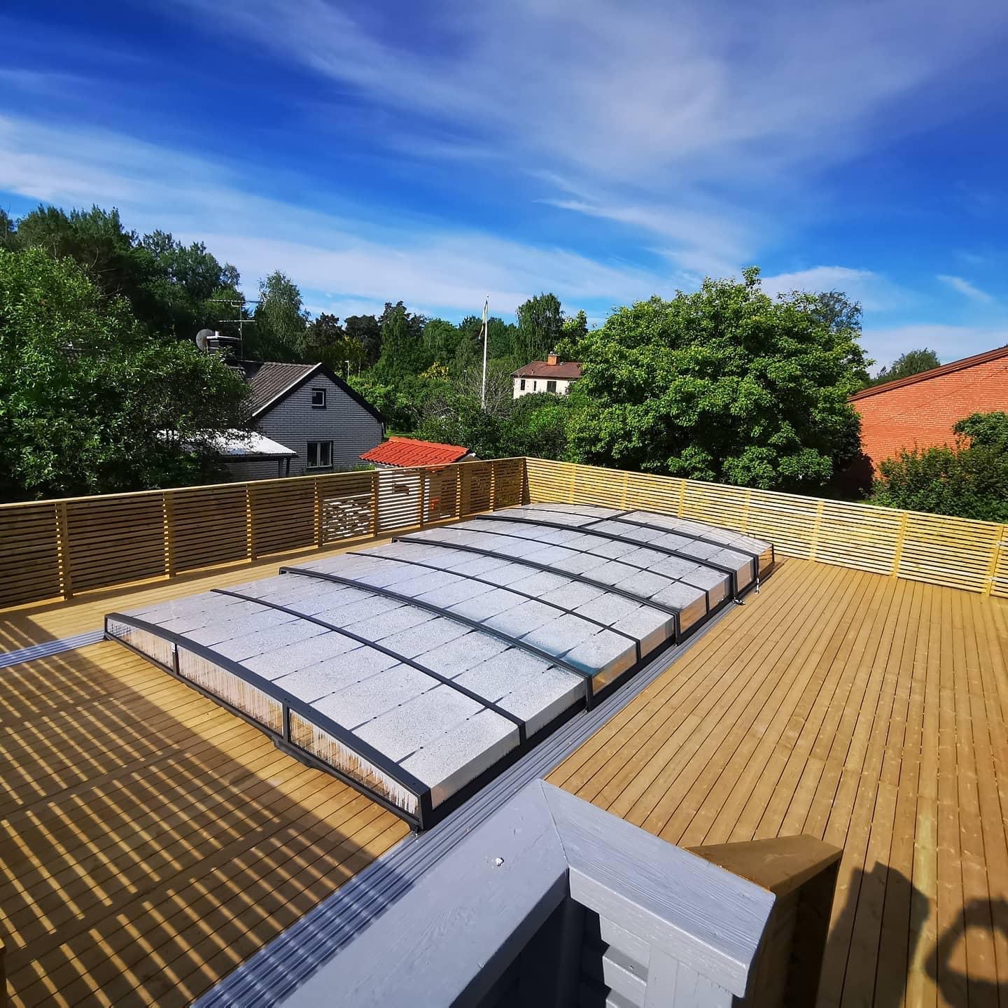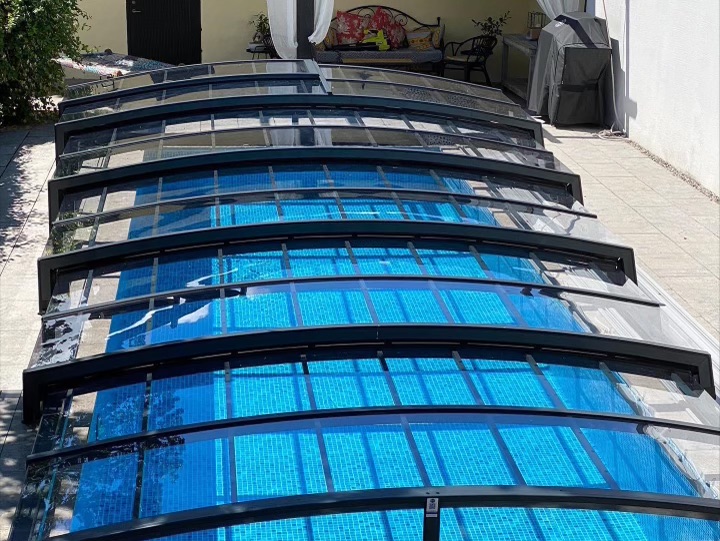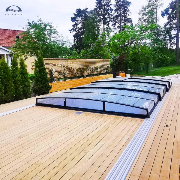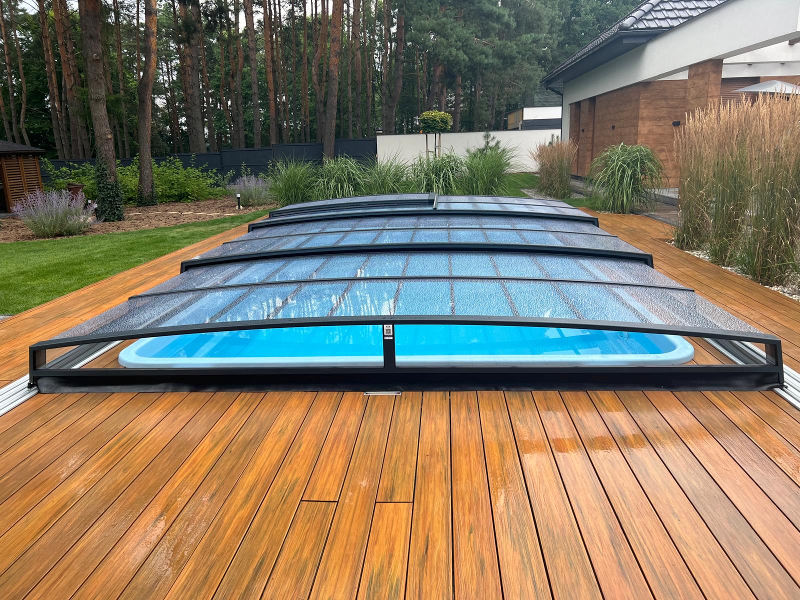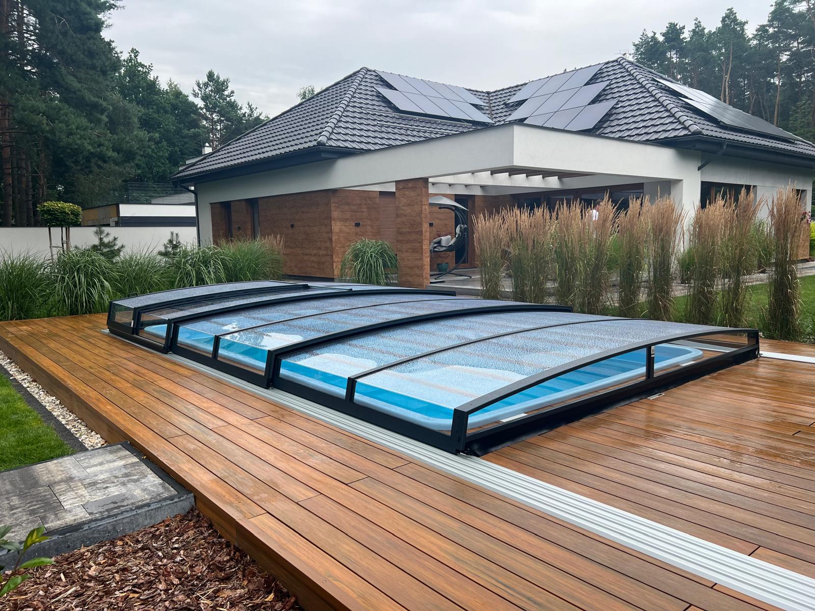 Bågen i den övre delen av konstruktionen leder perfekt bort vatten och liggande snö, vilket gör konstruktionen lätt att underhålla, och höjden på taket ger redan möjlighet till begränsad simning när taket är stängt.
