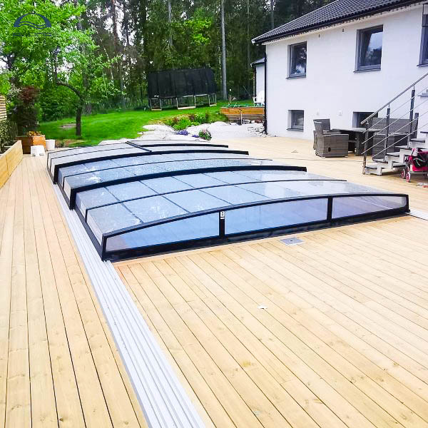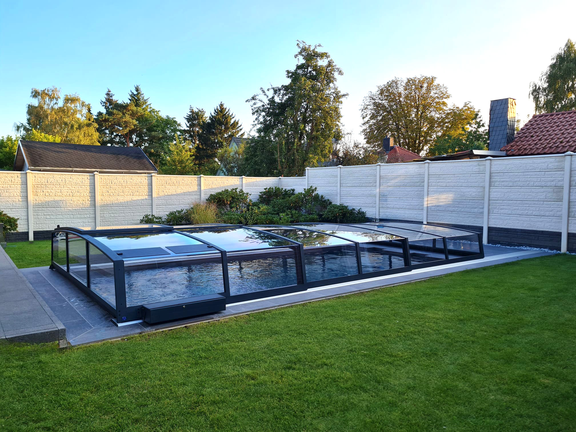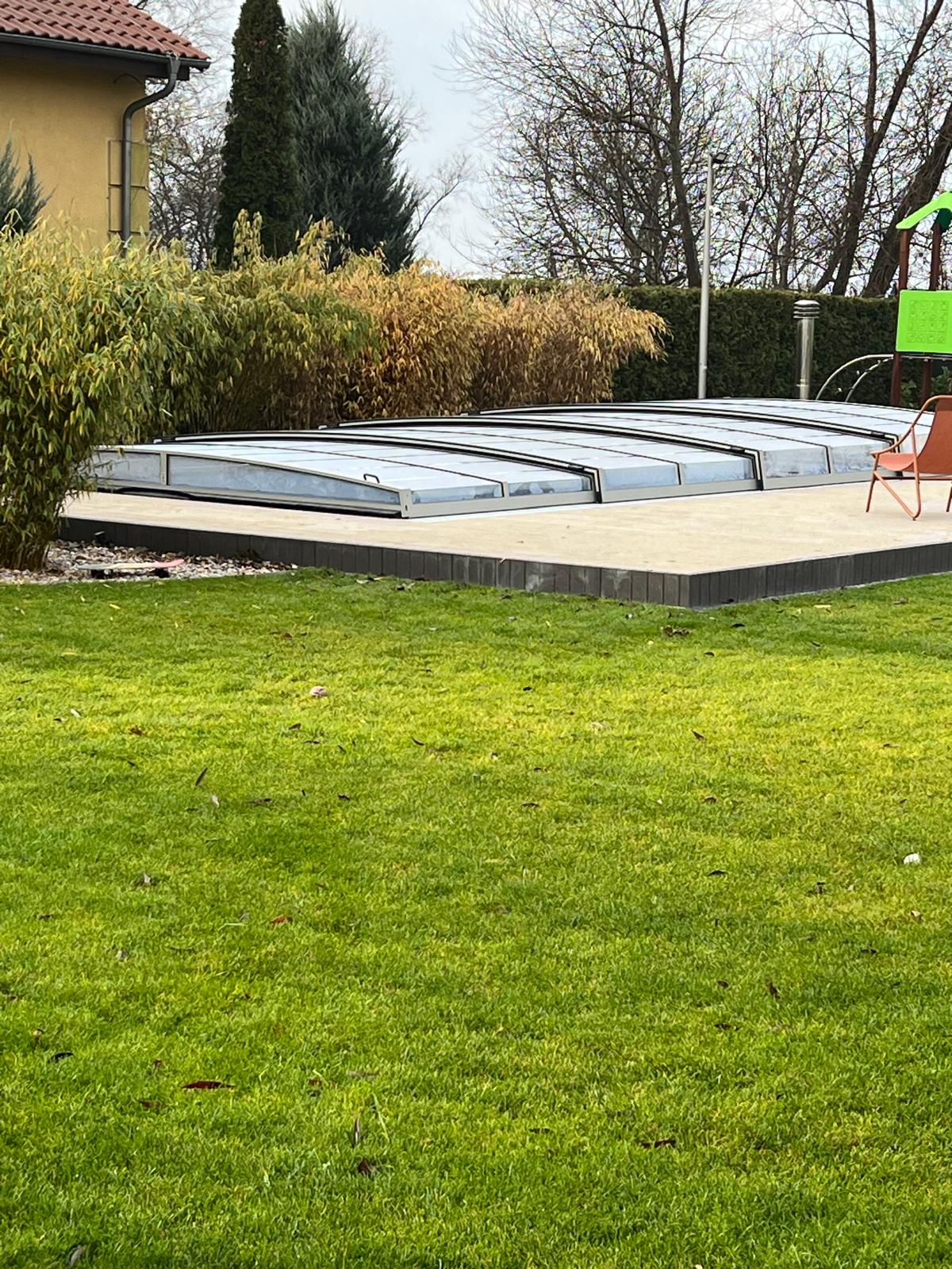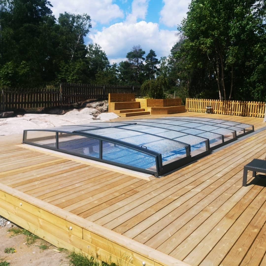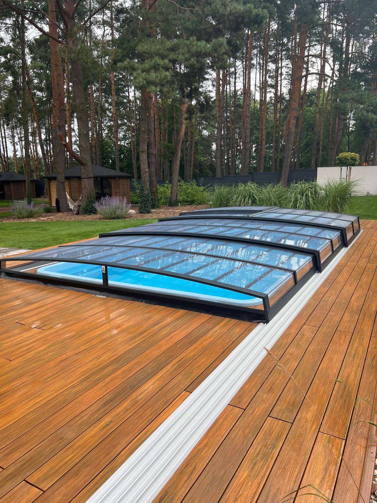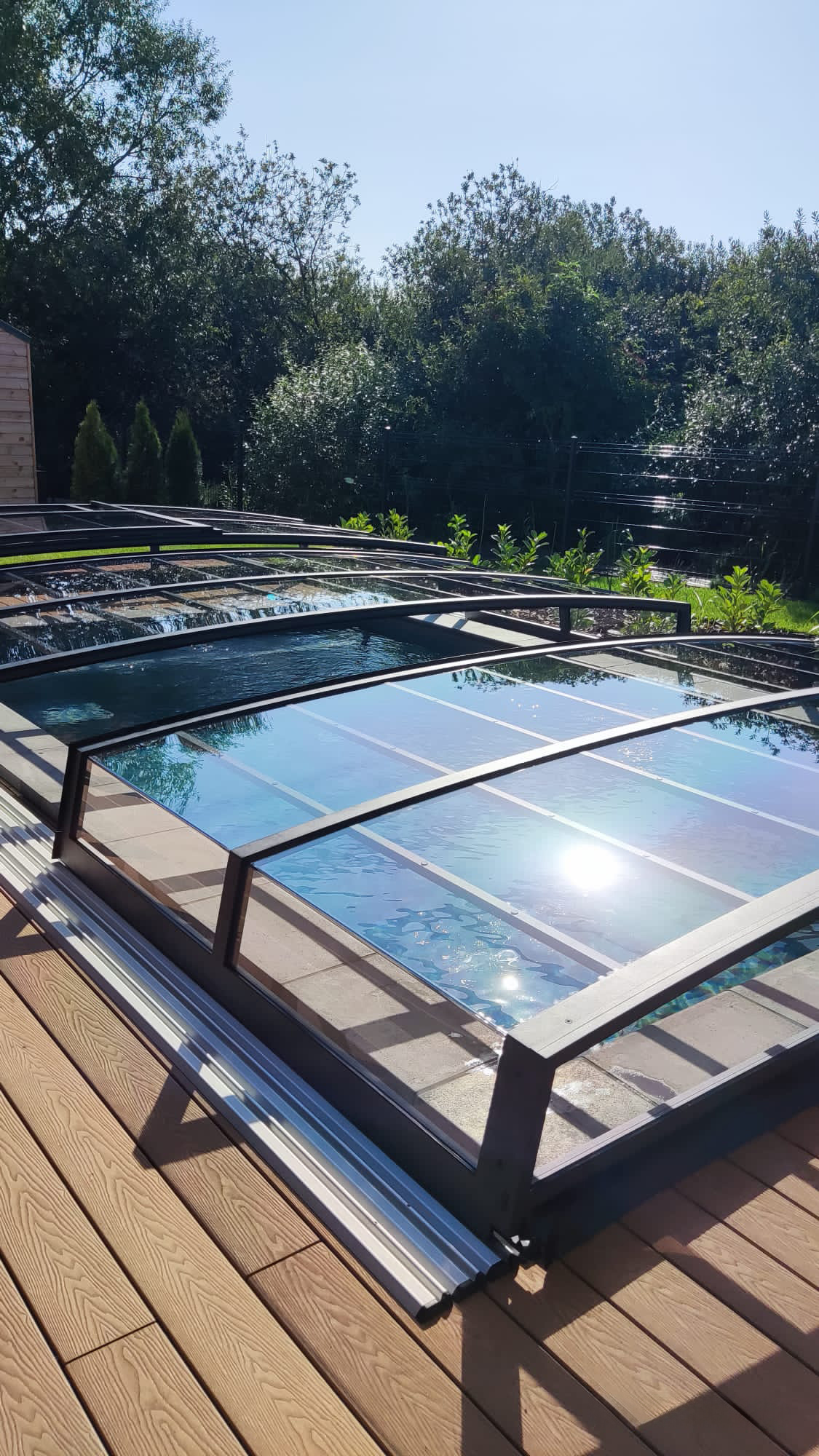 Bågen i den övre delen av konstruktionen leder perfekt bort vatten och liggande snö, vilket gör konstruktionen lätt att underhålla, och höjden på taket ger redan möjlighet till begränsad simning när taket är stängt.