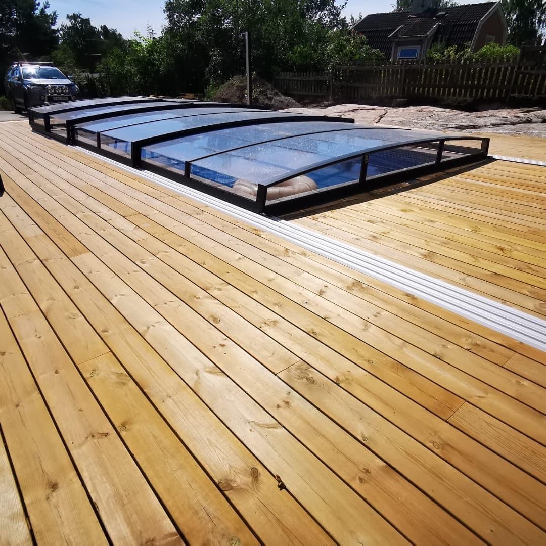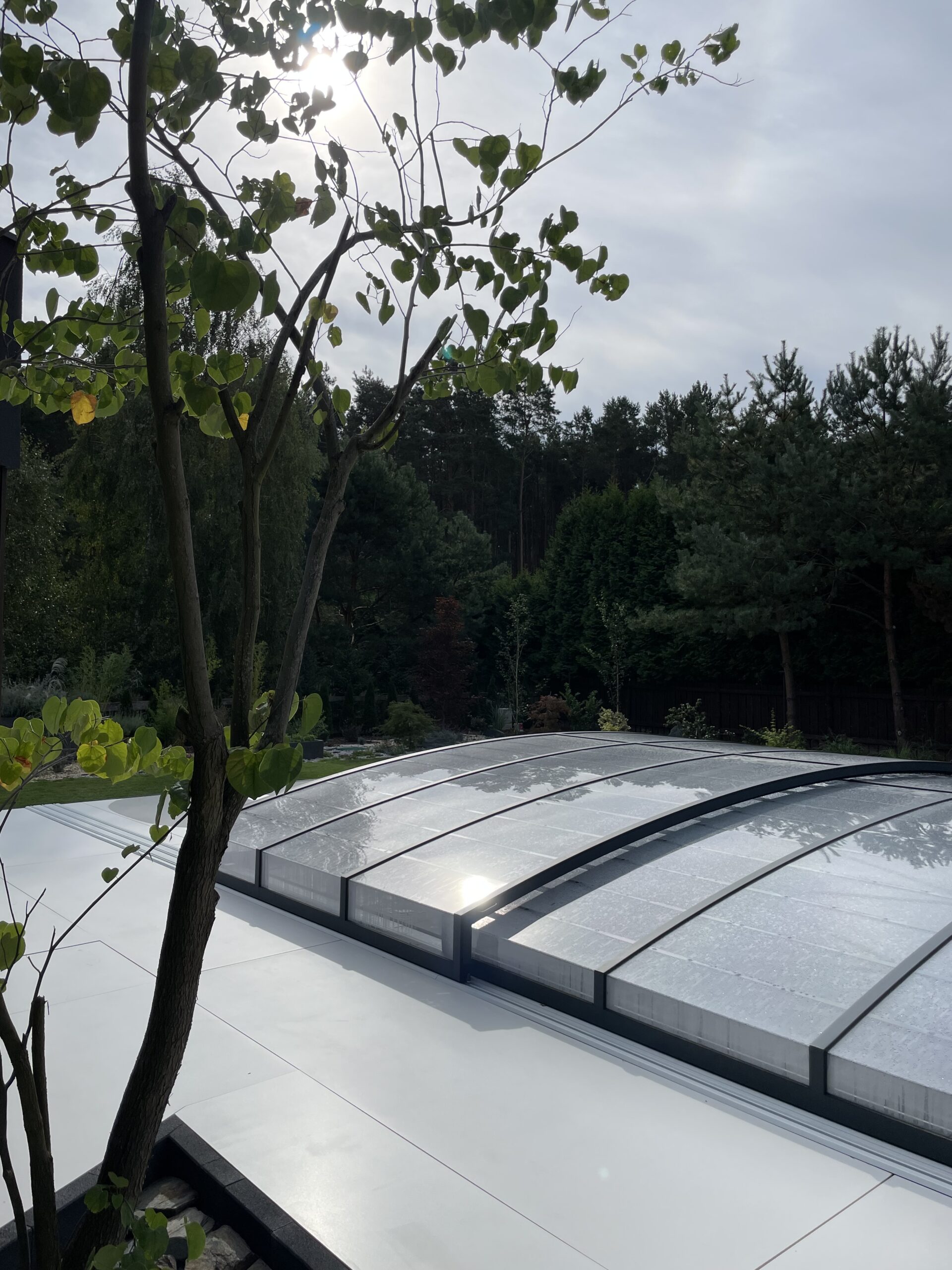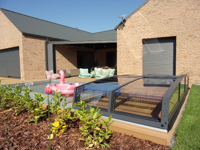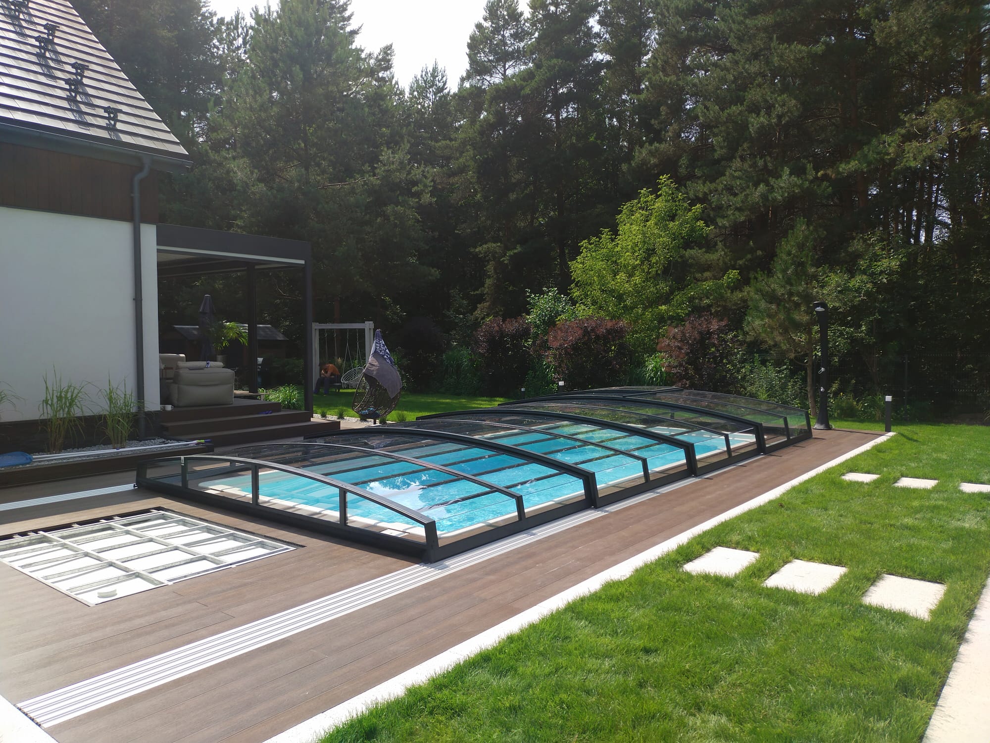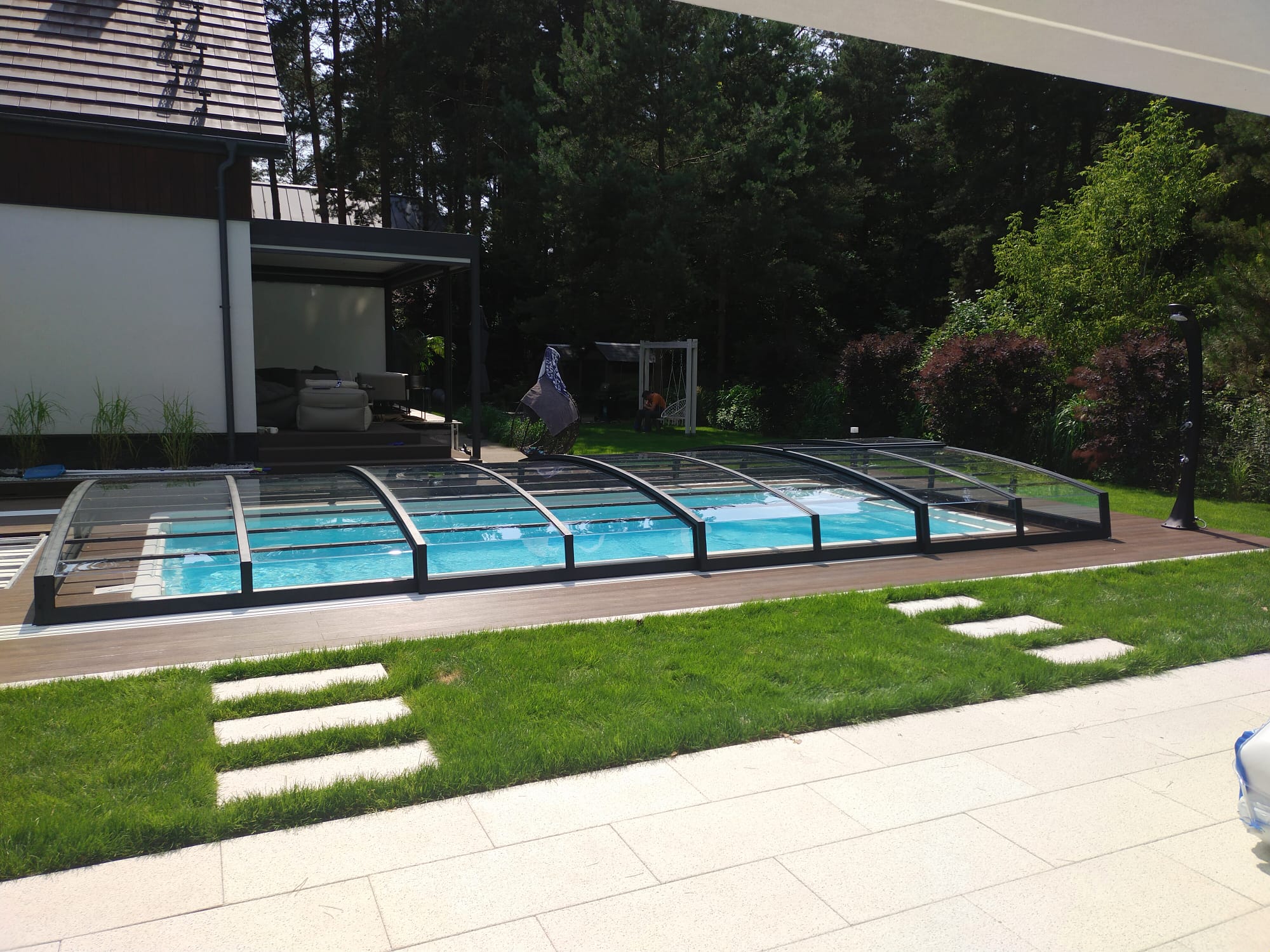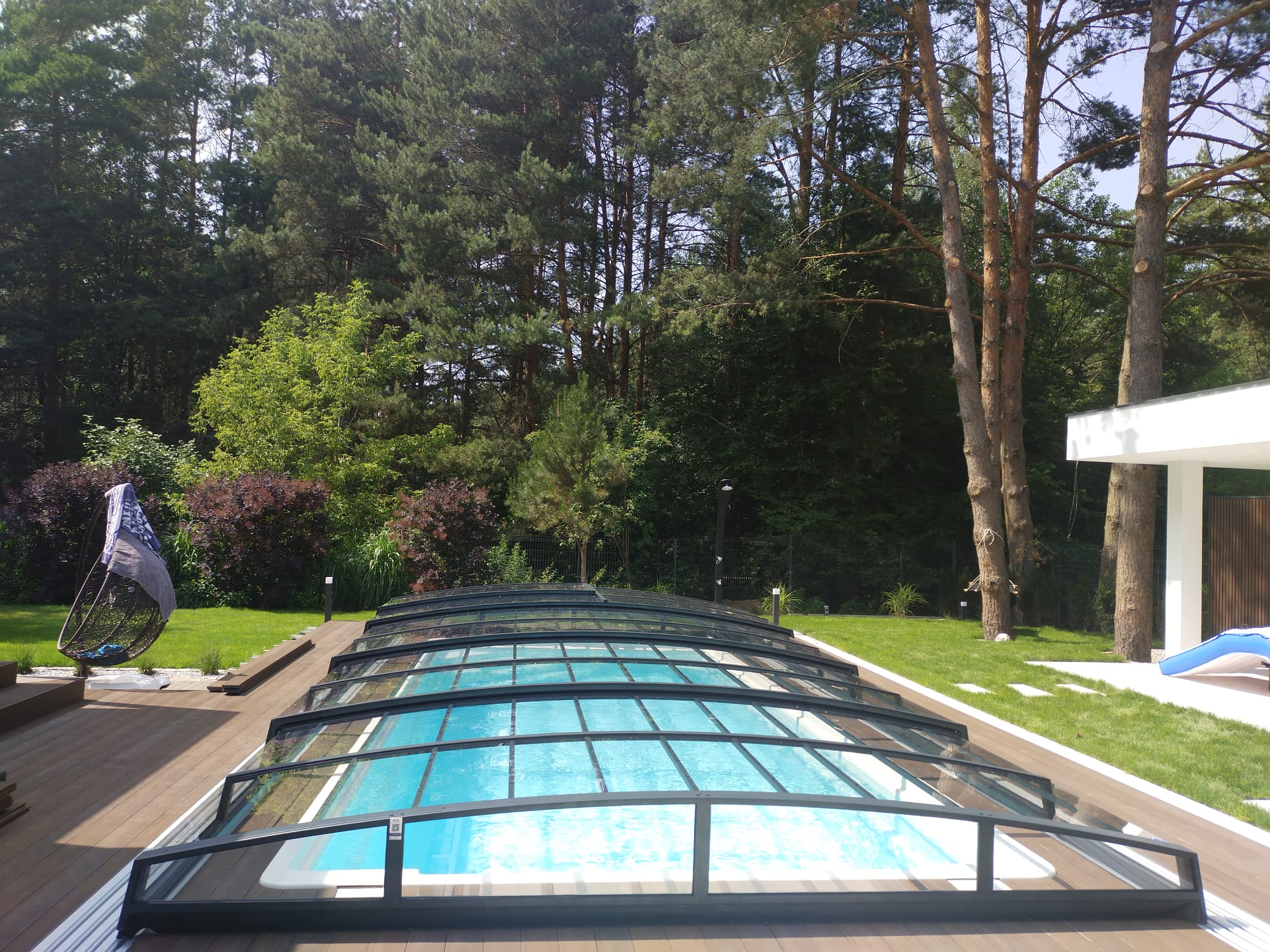 Bågen i den övre delen av konstruktionen leder perfekt bort vatten och liggande snö, vilket gör konstruktionen lätt att underhålla, och höjden på taket ger redan möjlighet till begränsad simning när taket är stängt.