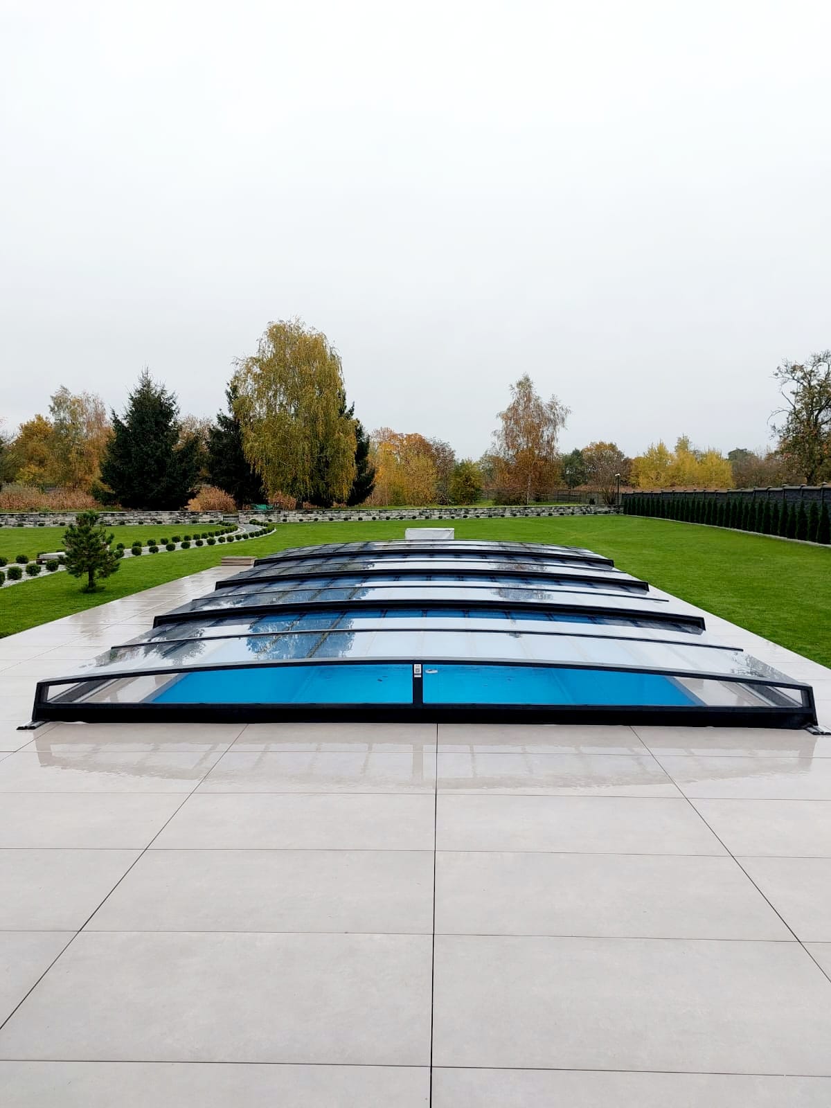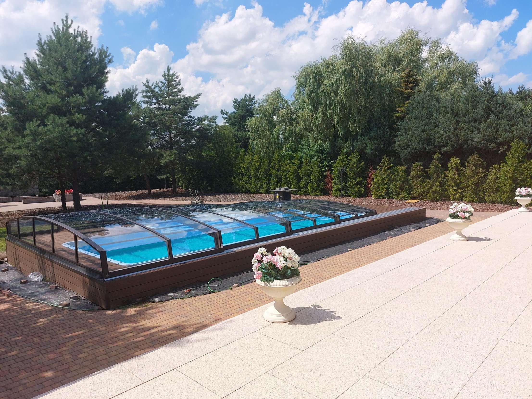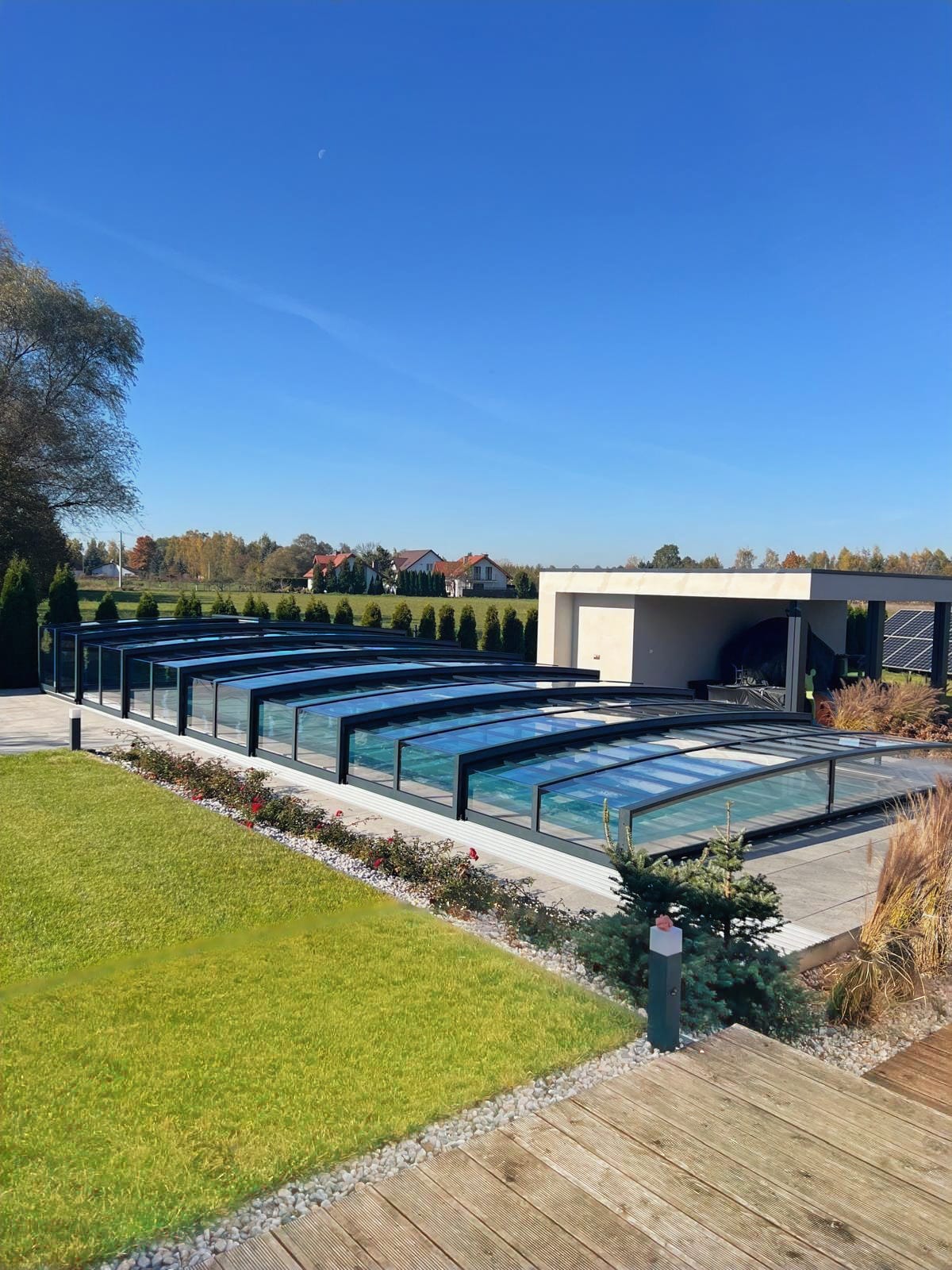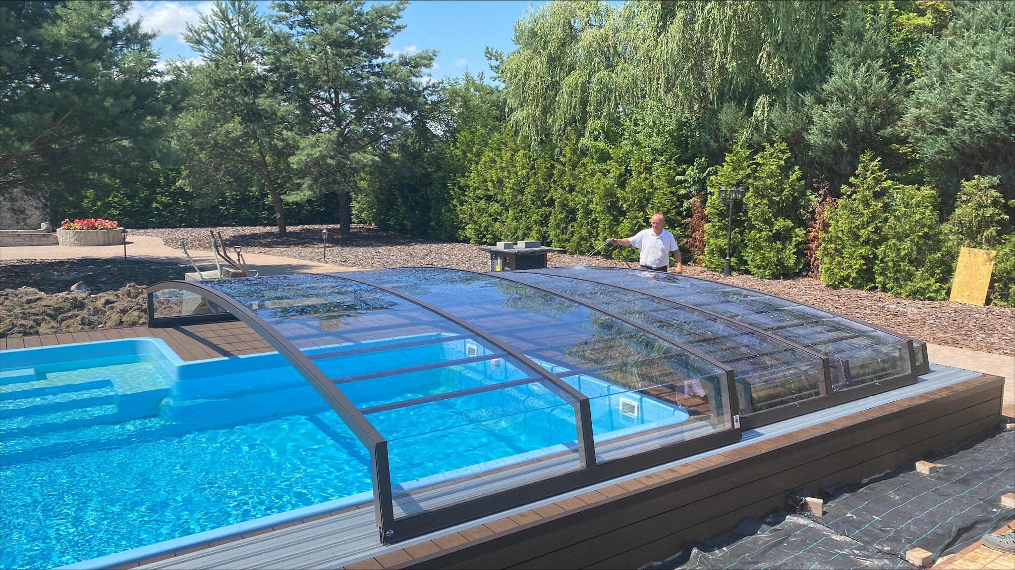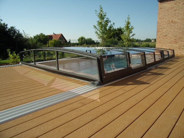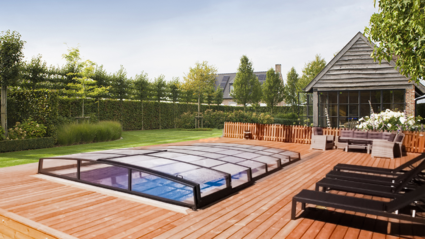 Bågen i den övre delen av konstruktionen leder perfekt bort vatten och liggande snö, vilket gör konstruktionen lätt att underhålla, och höjden på taket ger redan möjlighet till begränsad simning när taket är stängt.