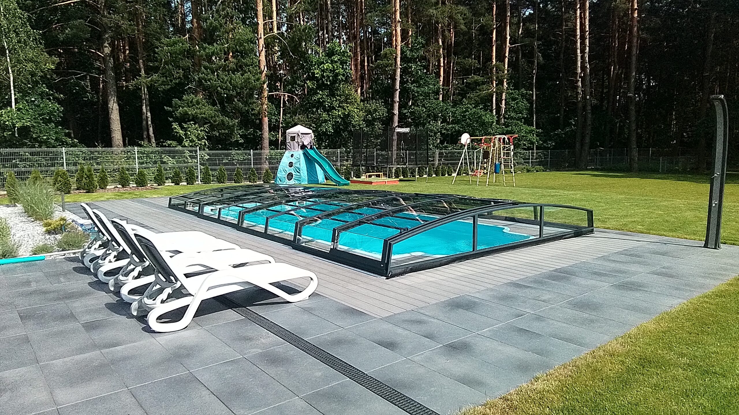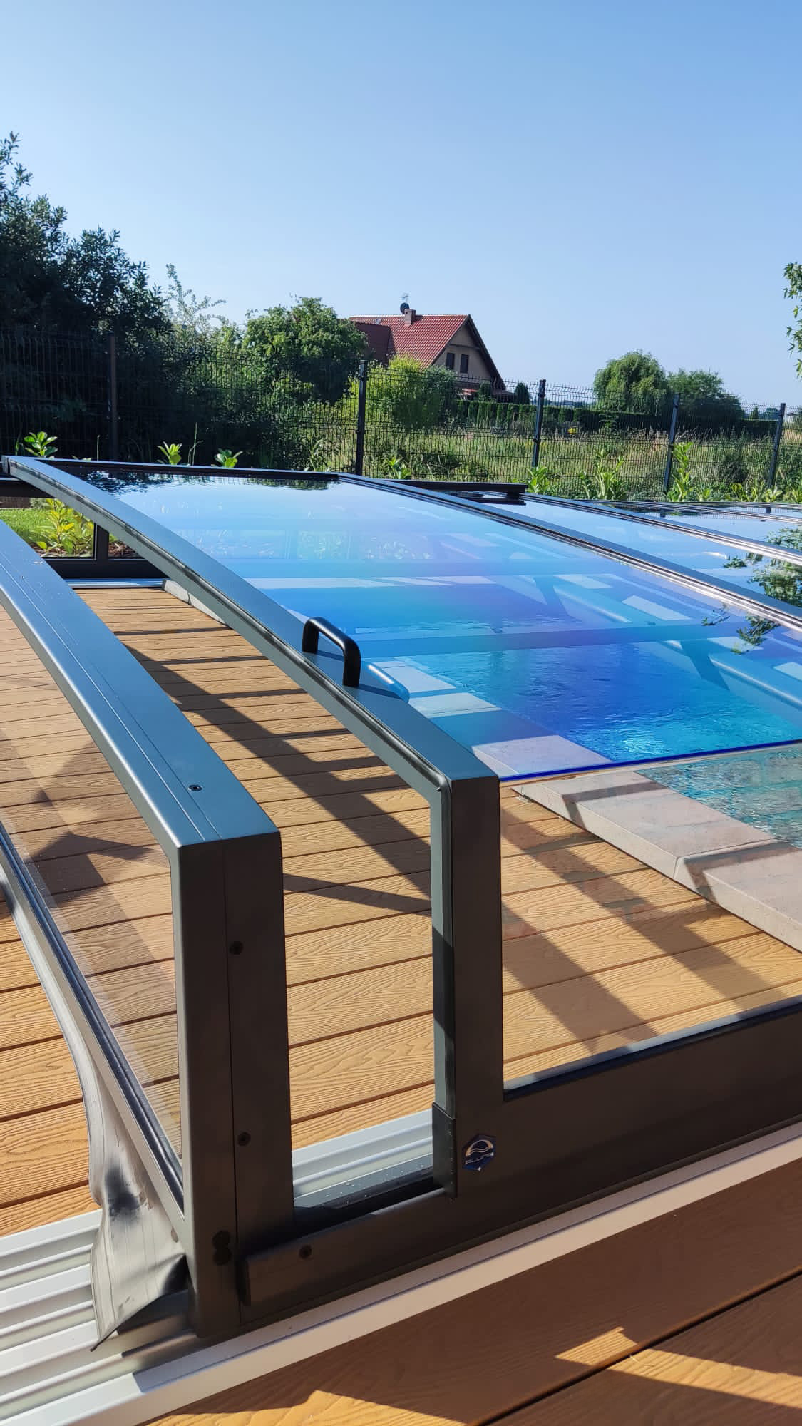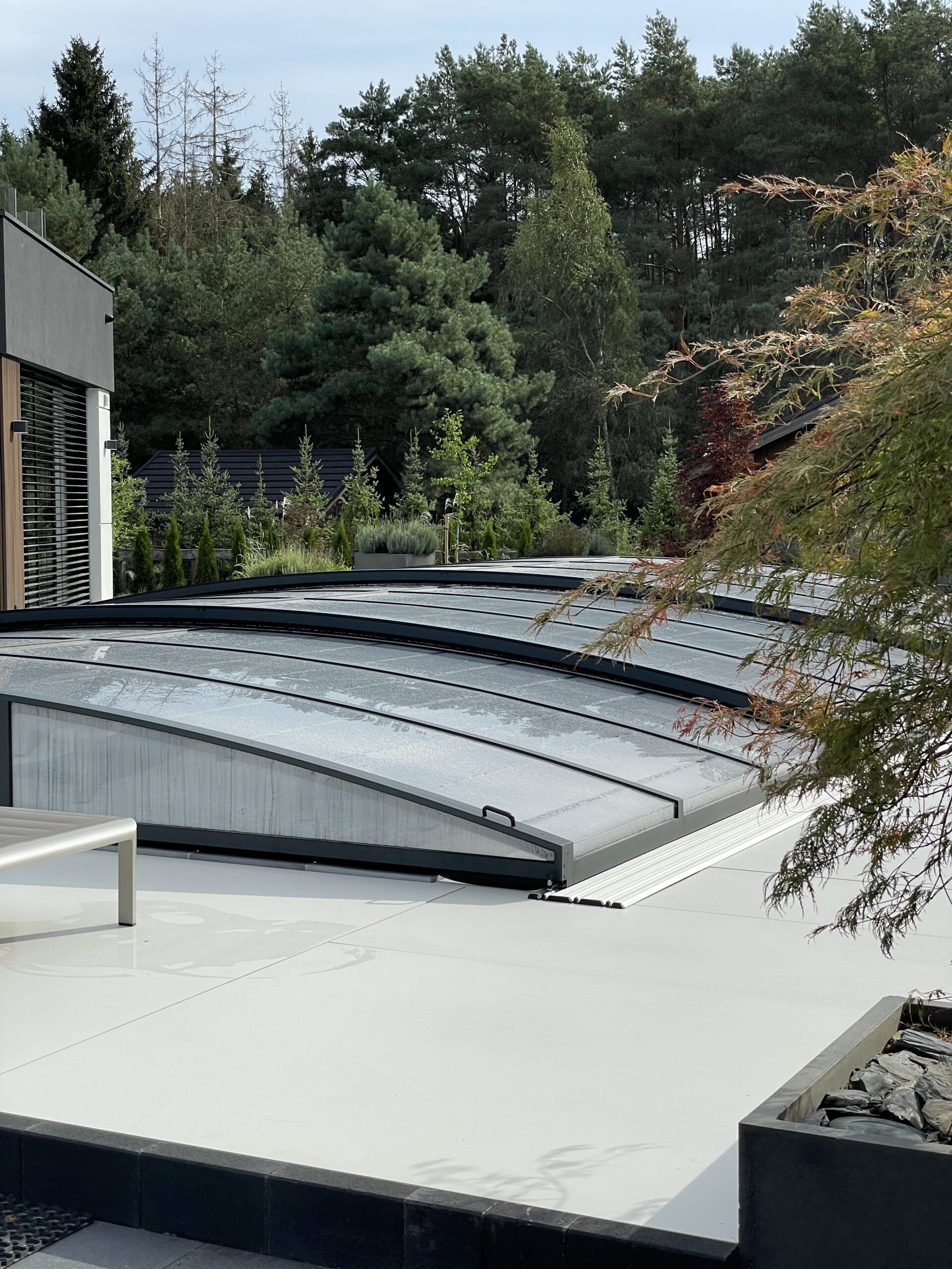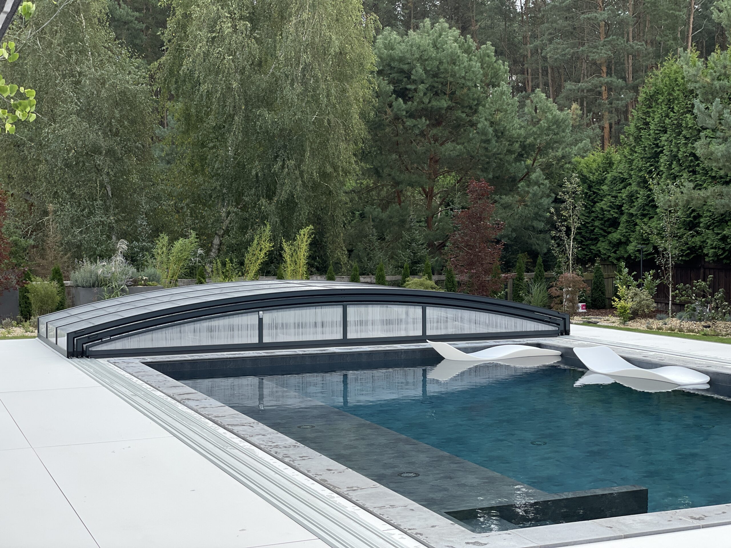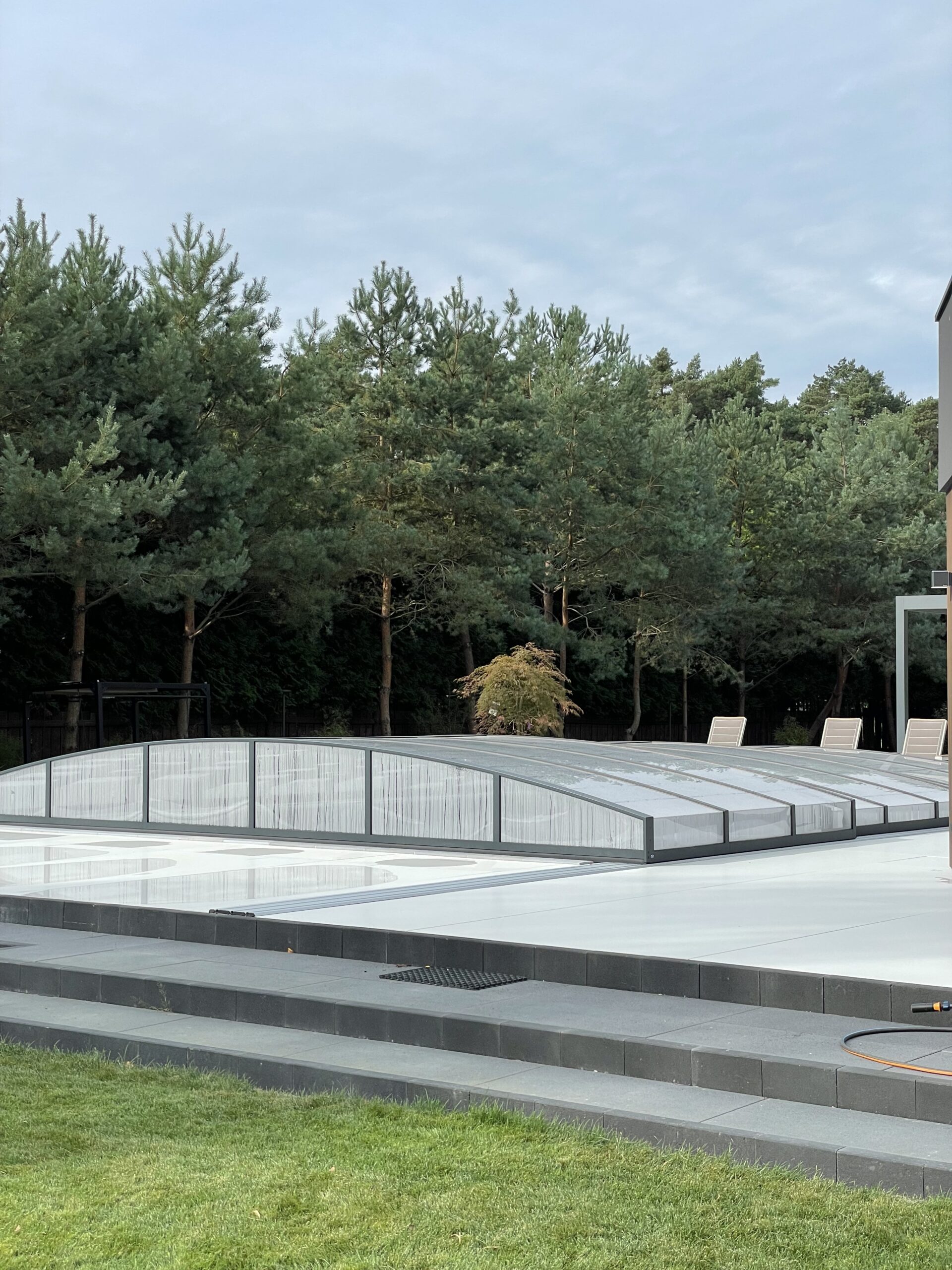Bågen i den övre delen av konstruktionen leder perfekt bort vatten och liggande snö, vilket gör konstruktionen lätt att underhålla, och höjden på taket ger redan möjlighet till begränsad simning när taket är stängt.