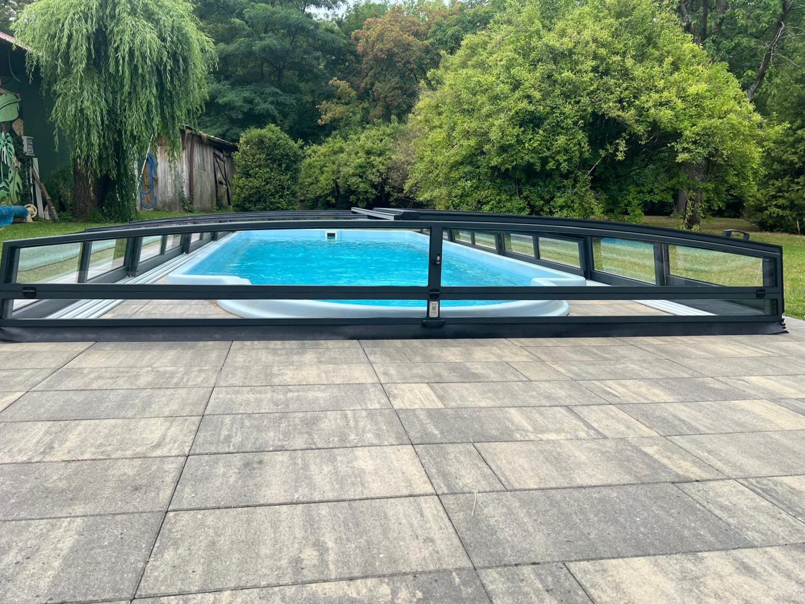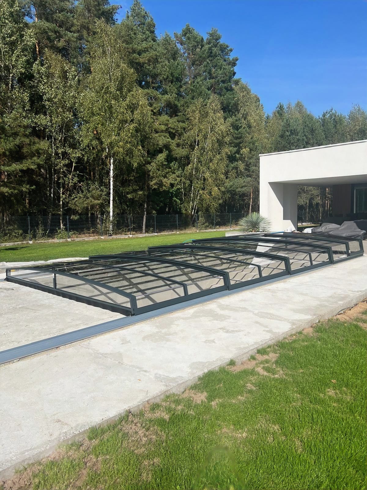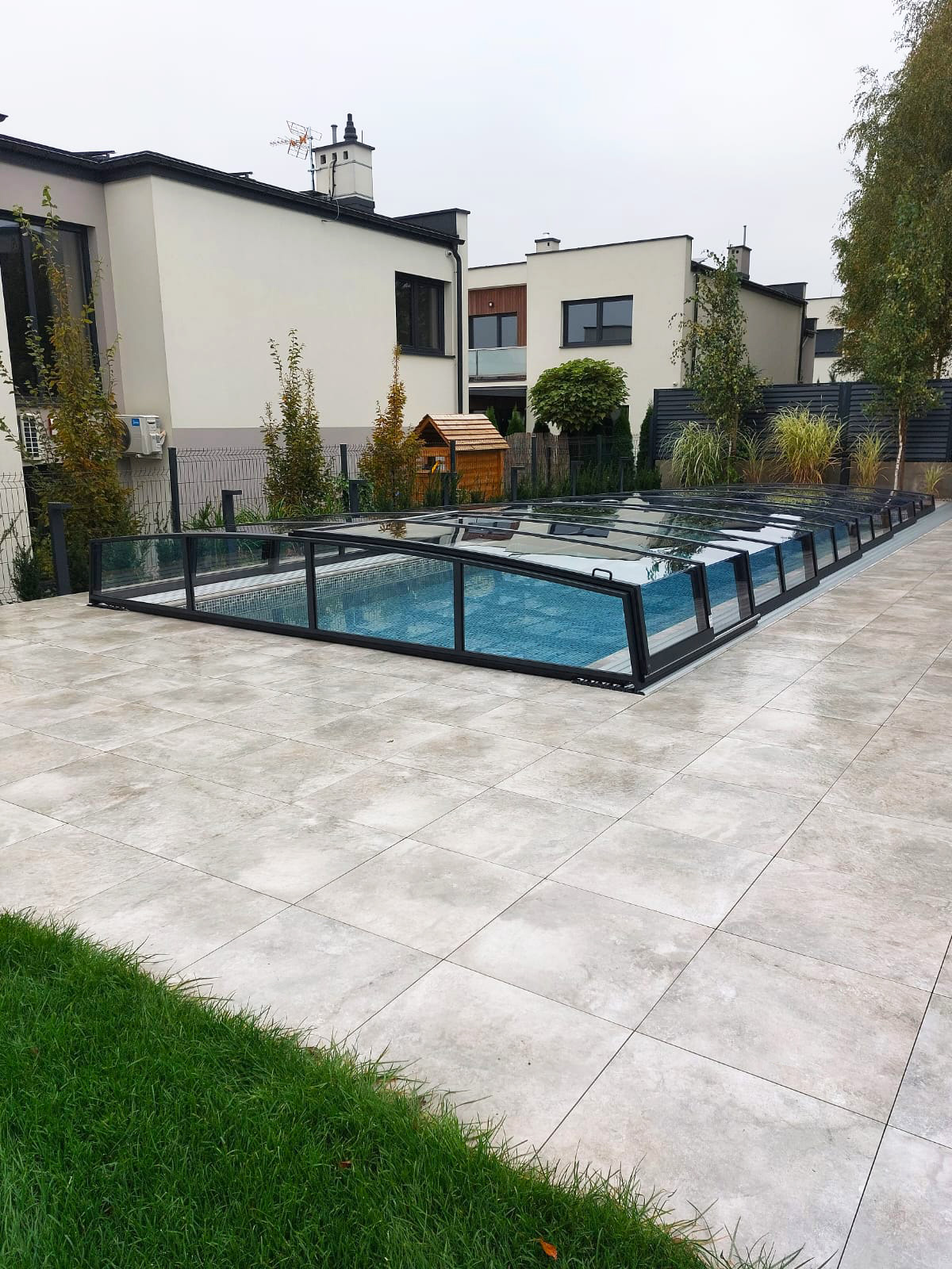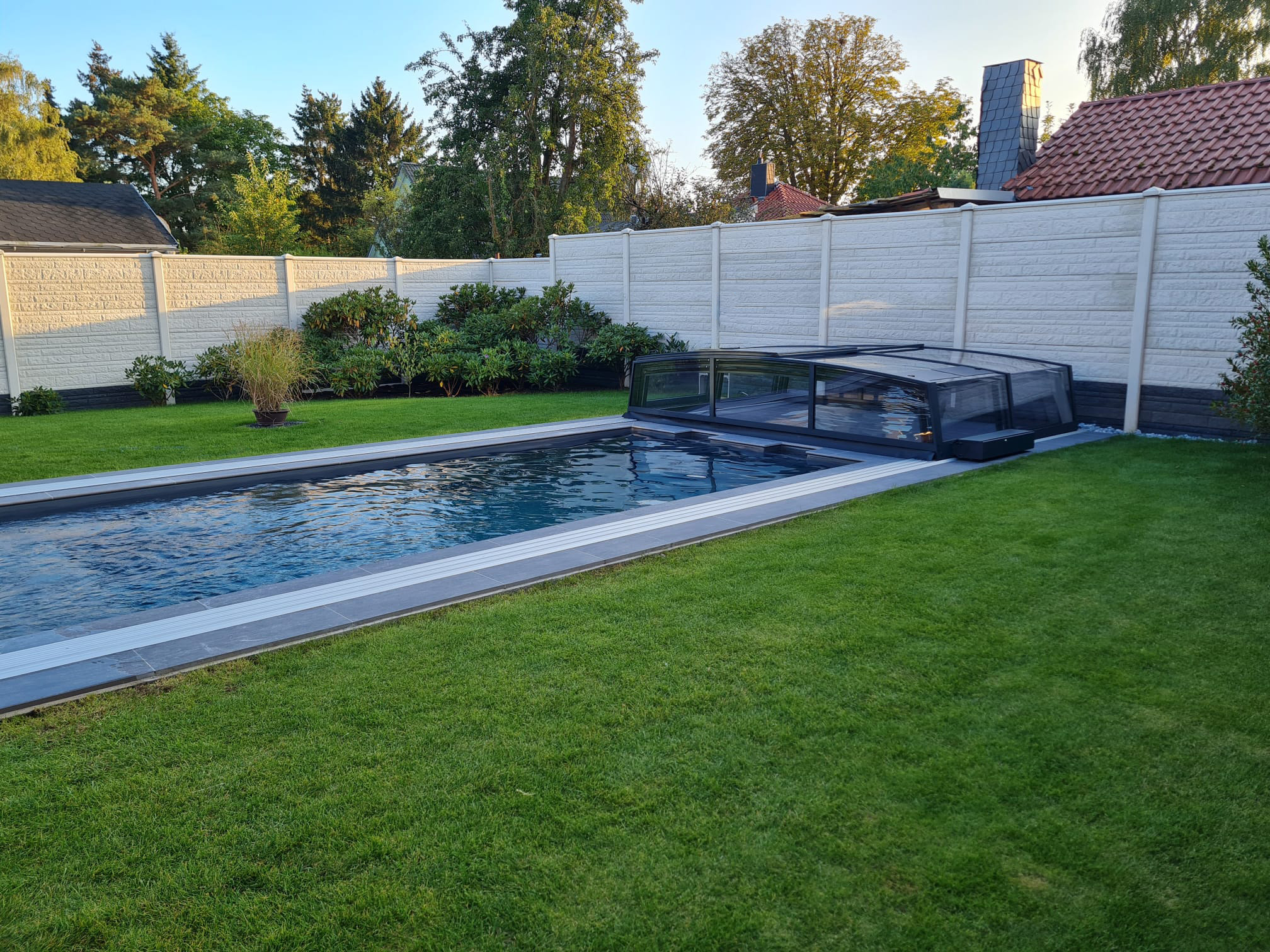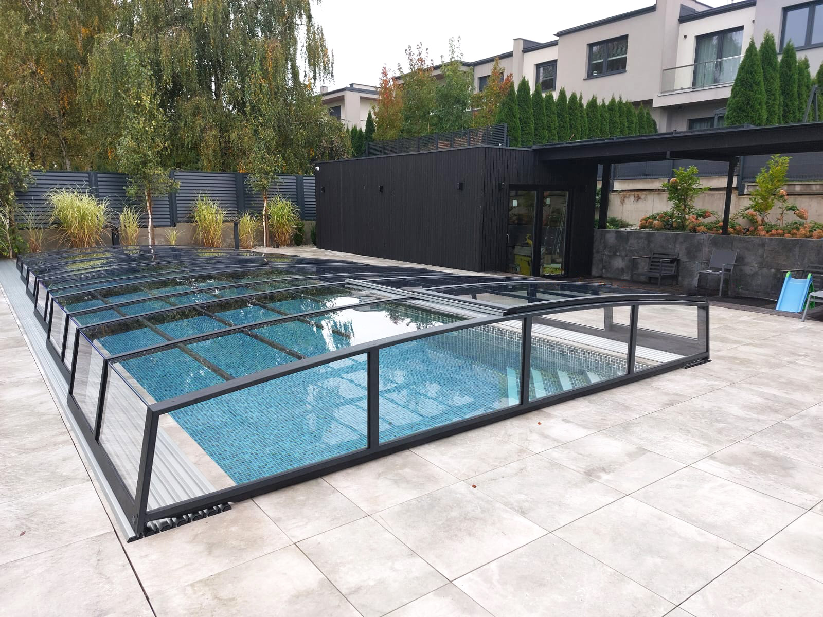 Bågen i den övre delen av konstruktionen leder perfekt bort vatten och liggande snö, vilket gör konstruktionen lätt att underhålla, och höjden på taket ger redan möjlighet till begränsad simning när taket är stängt.
