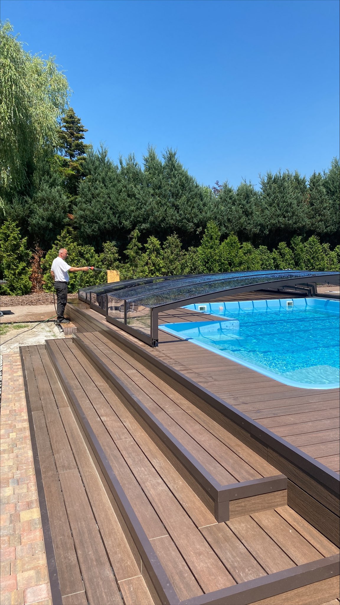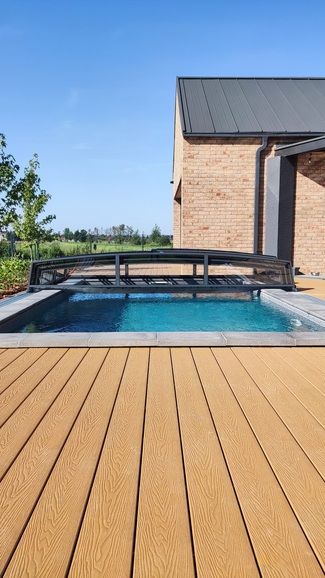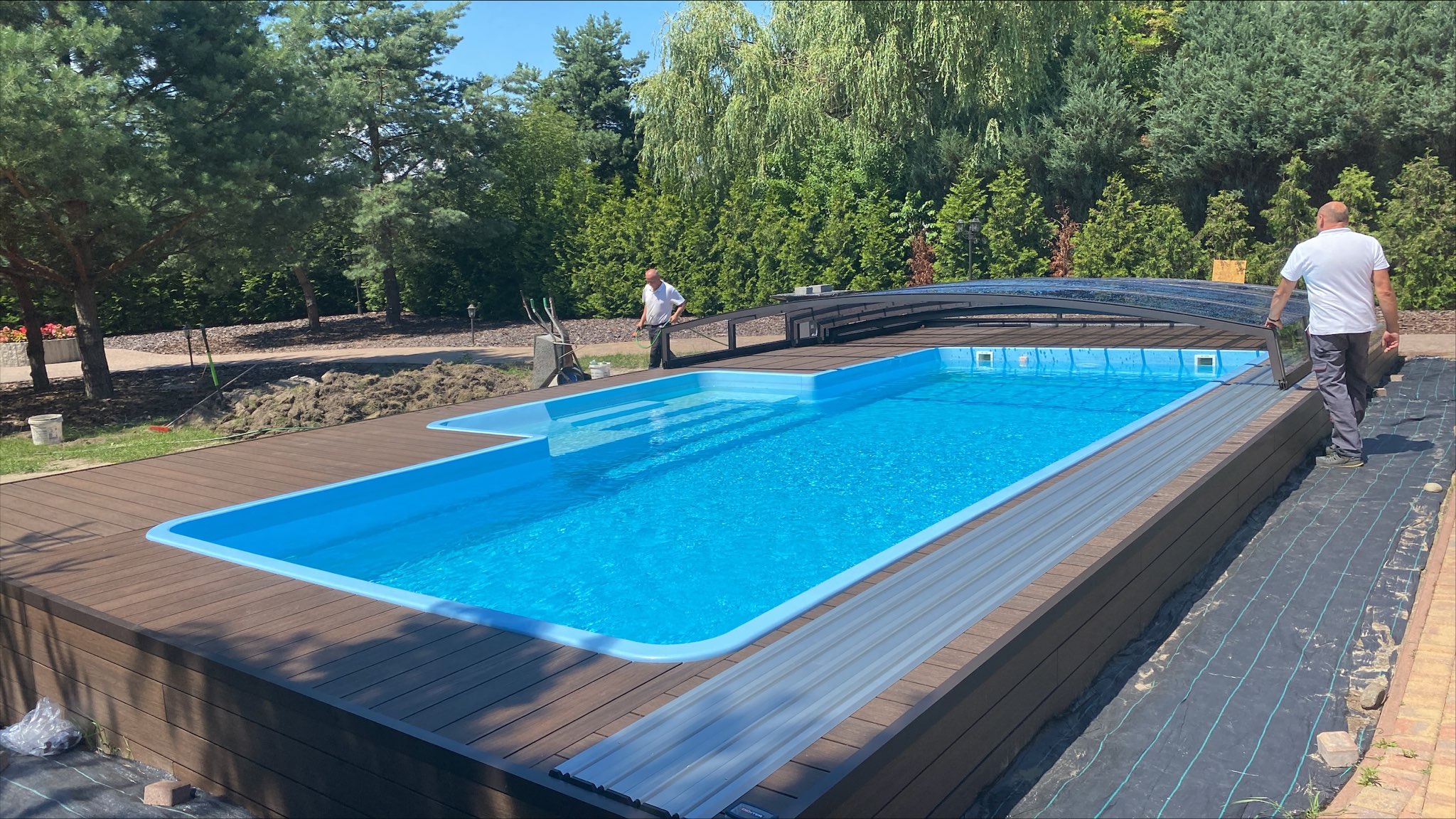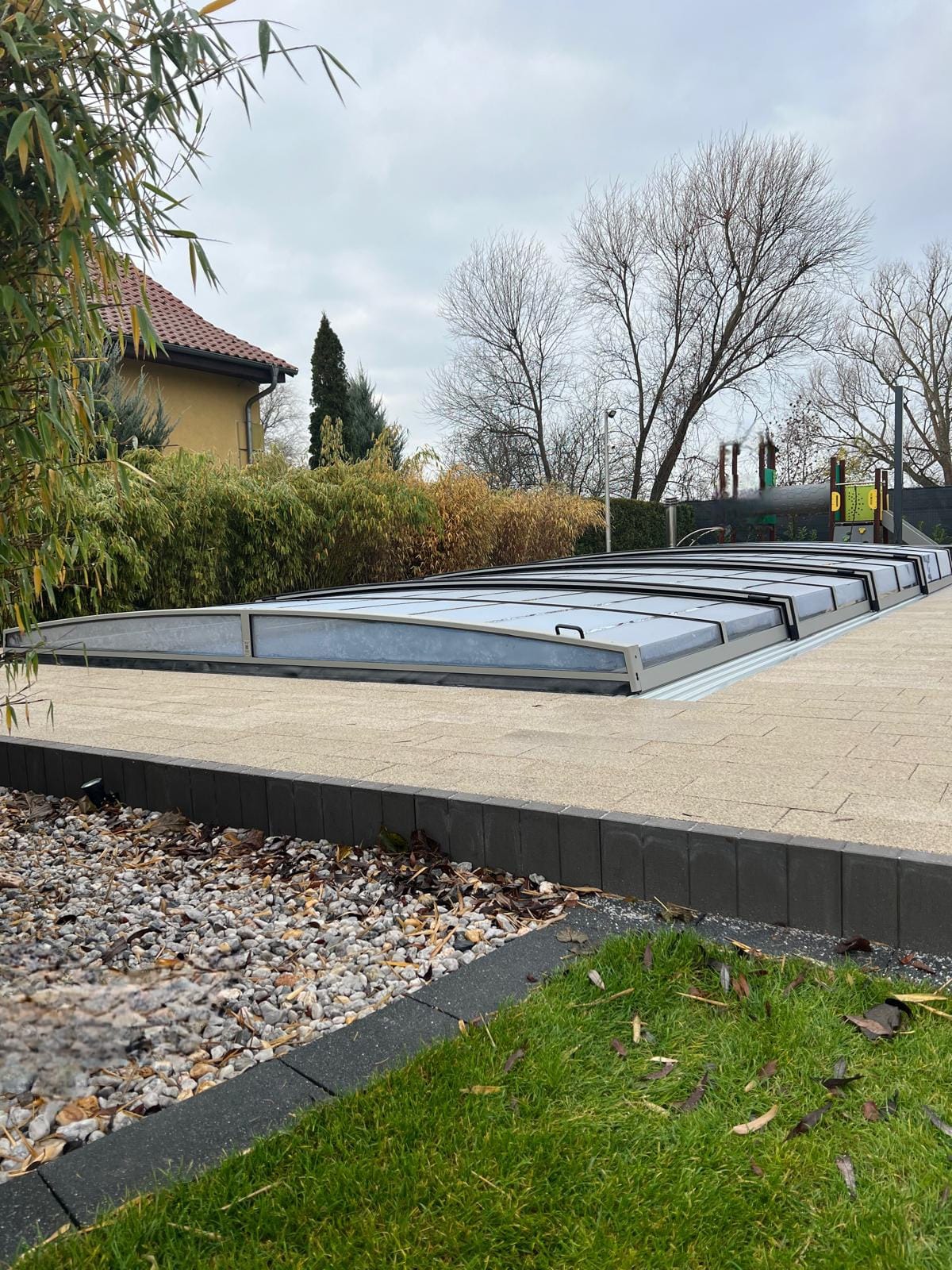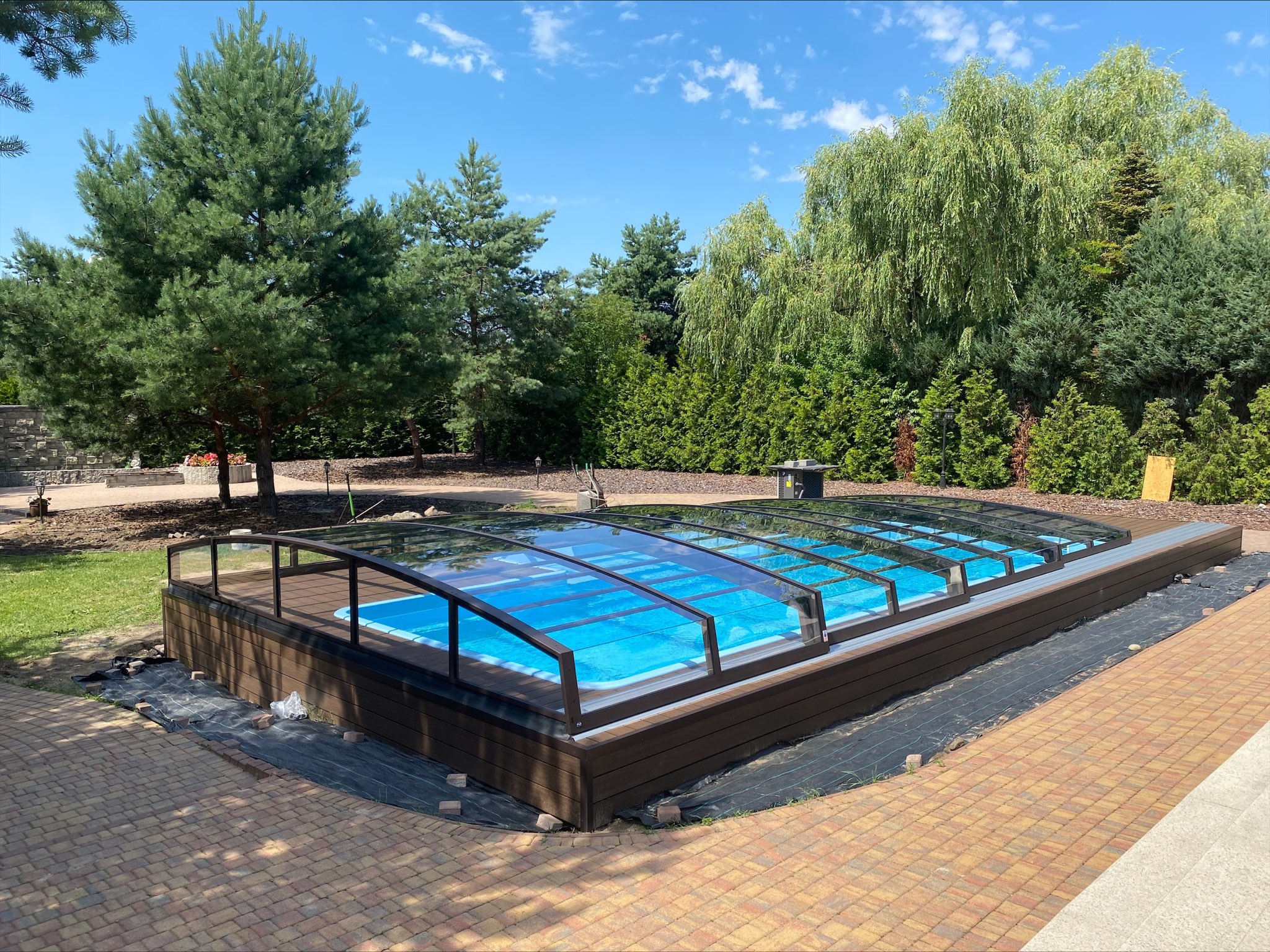 Bågen i den övre delen av konstruktionen leder perfekt bort vatten och liggande snö, vilket gör konstruktionen lätt att underhålla, och höjden på taket ger redan möjlighet till begränsad simning när taket är stängt.