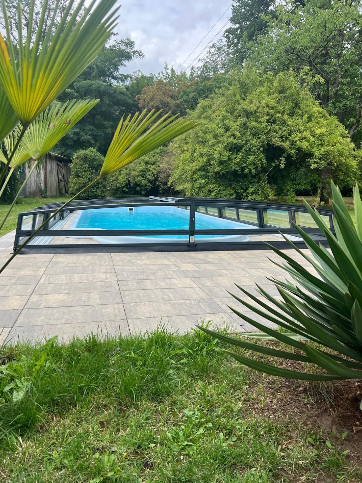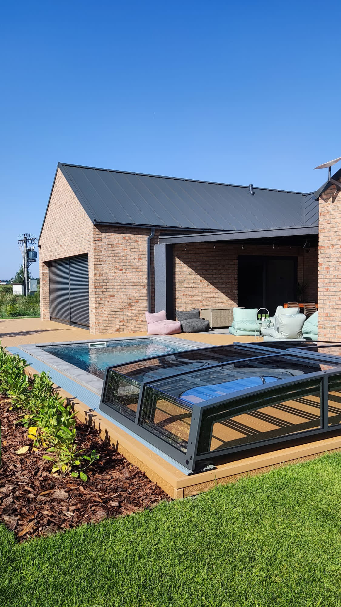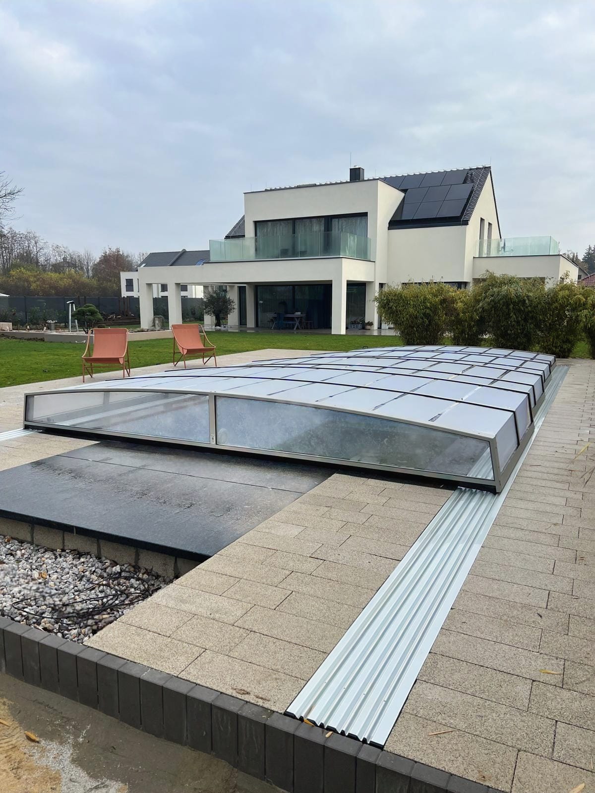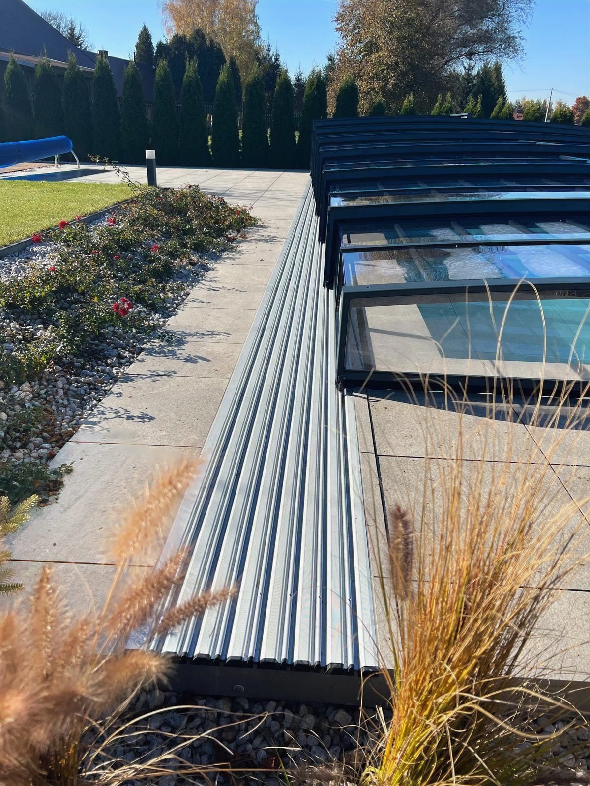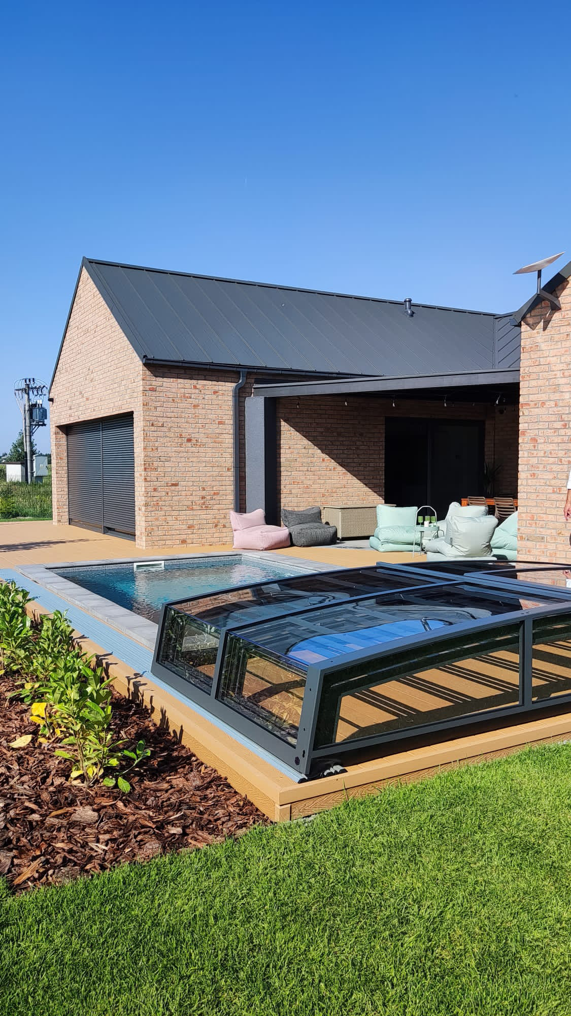 Bågen i den övre delen av konstruktionen leder perfekt bort vatten och liggande snö, vilket gör konstruktionen lätt att underhålla, och höjden på taket ger redan möjlighet till begränsad simning när taket är stängt.