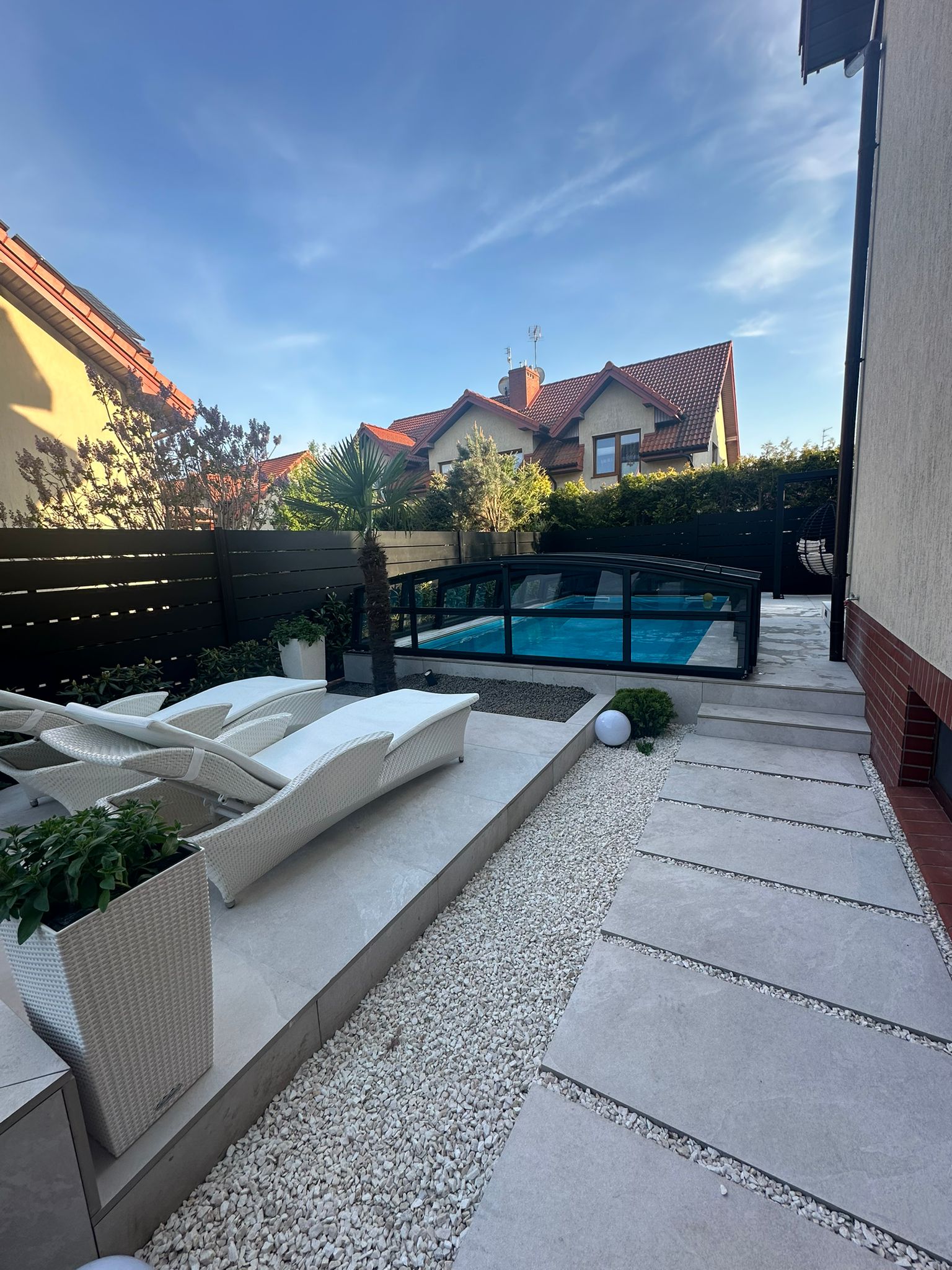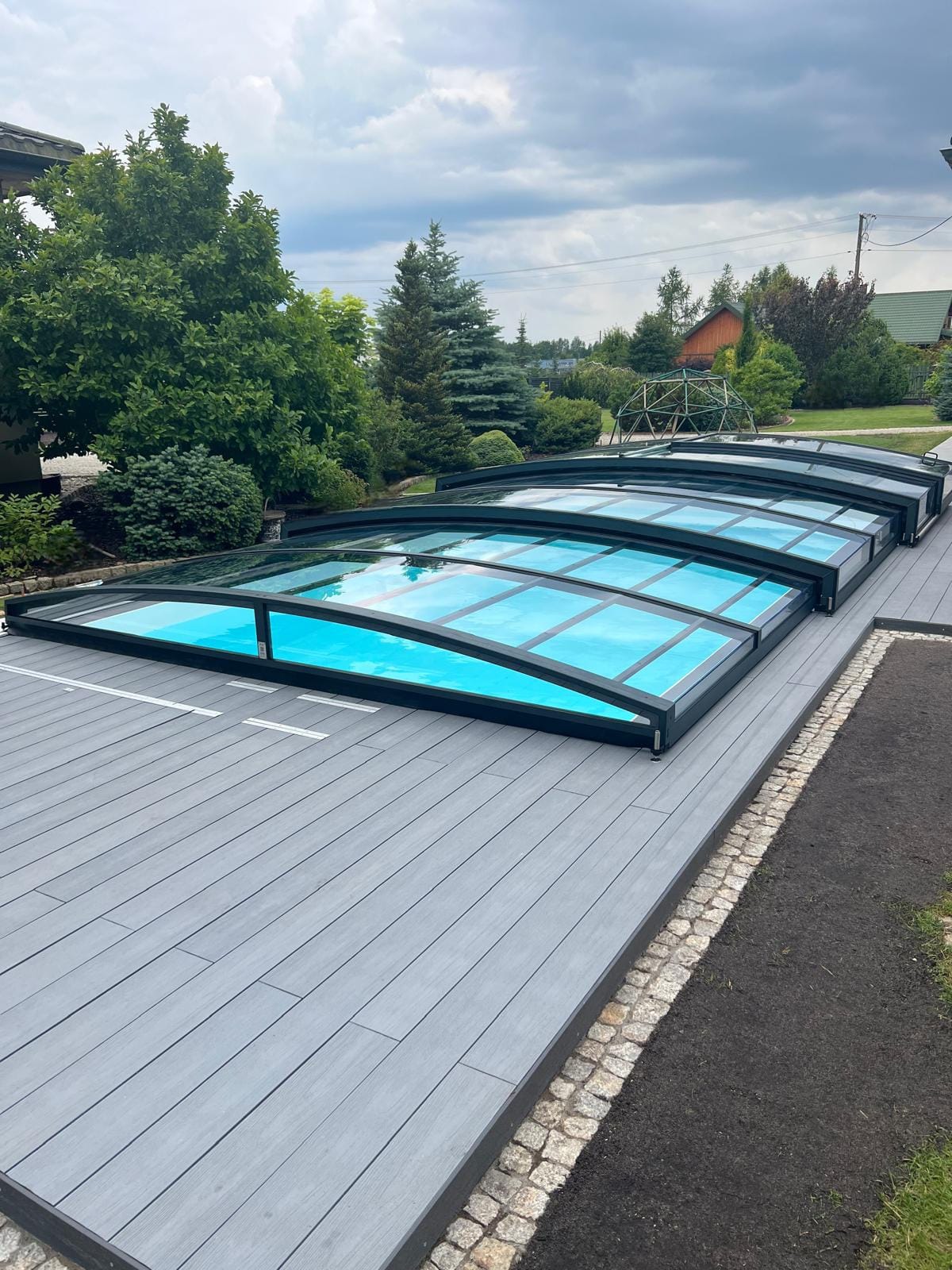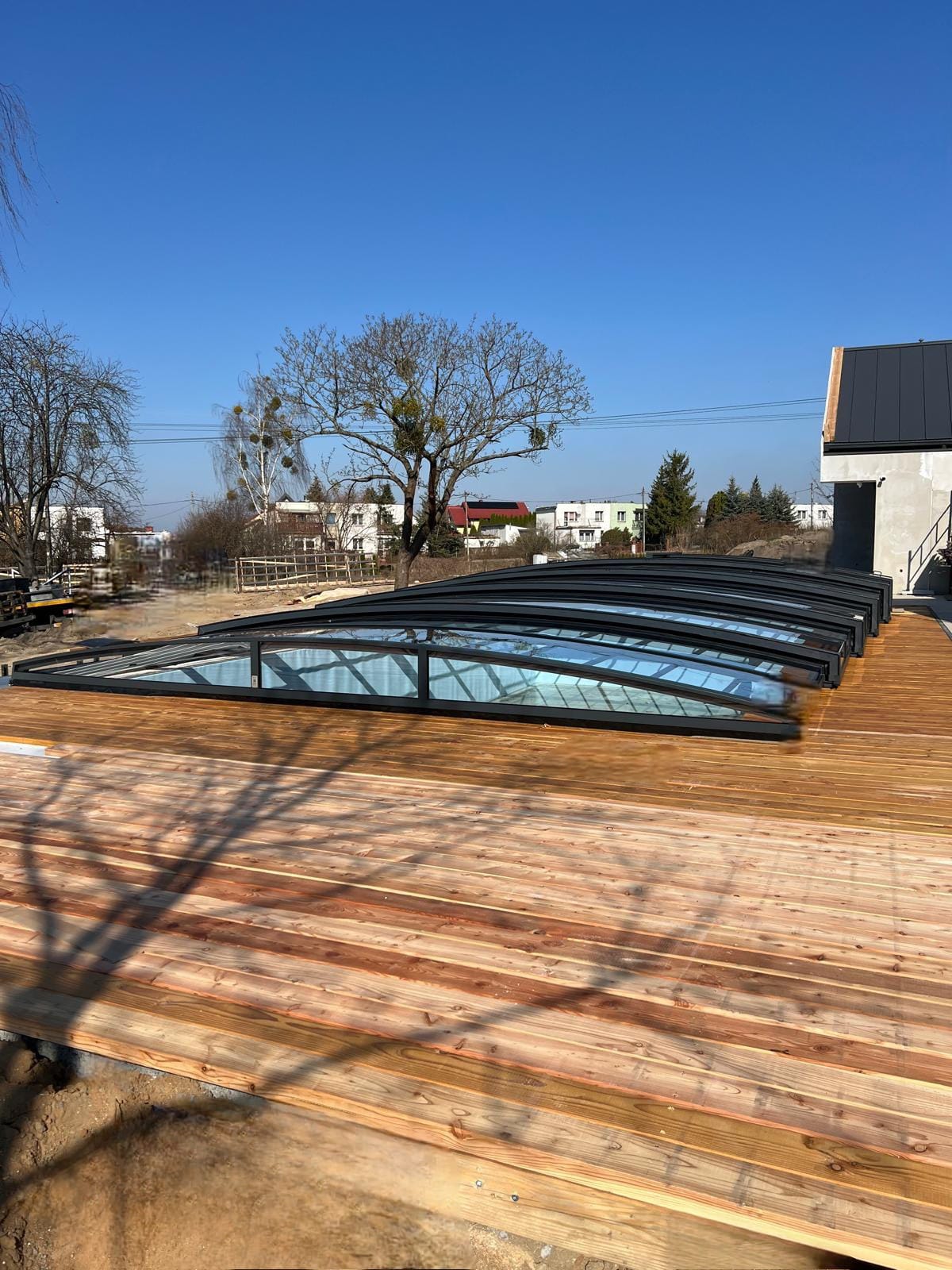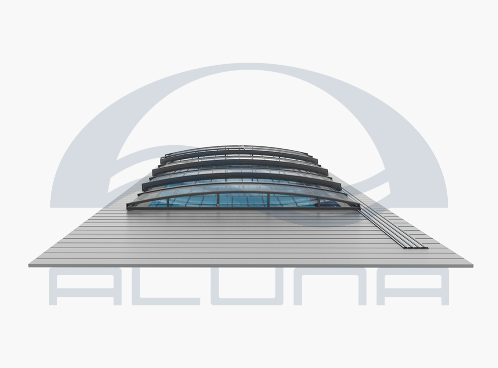 Detta tak från lågserien är baserat på det enkelriktade skensystemet R1. På ena sidan fungerar systemet på en standardskena (vilket gör det stabilt och hållbart), och på den andra – på hjul utan skena, vilket gör det möjligt att behålla den ena sidan av terrassen orörd.