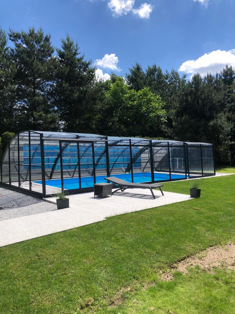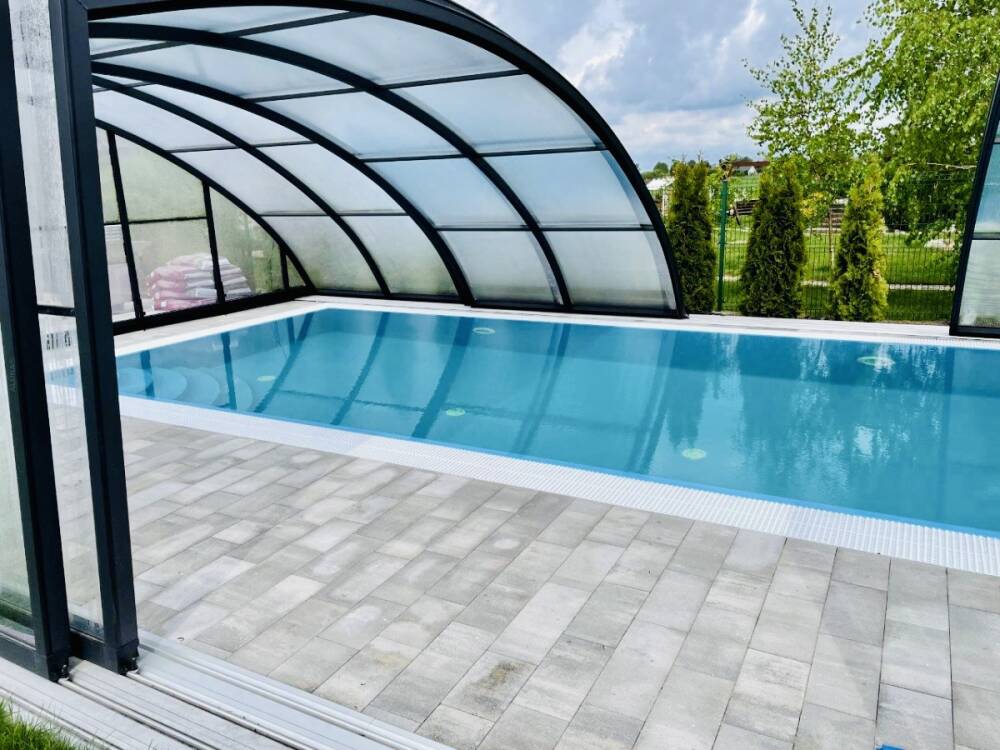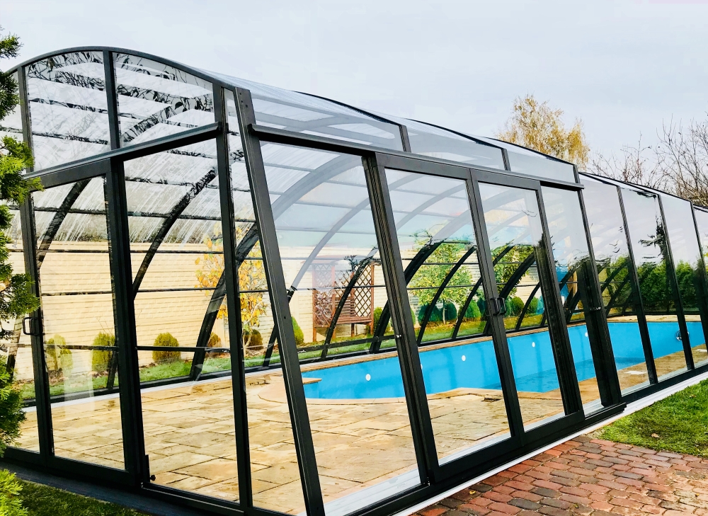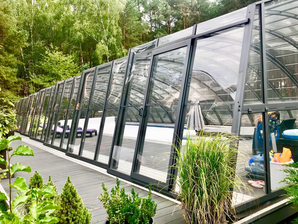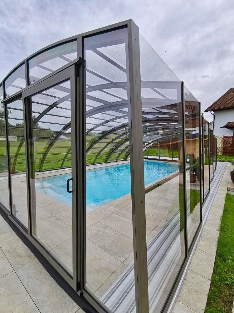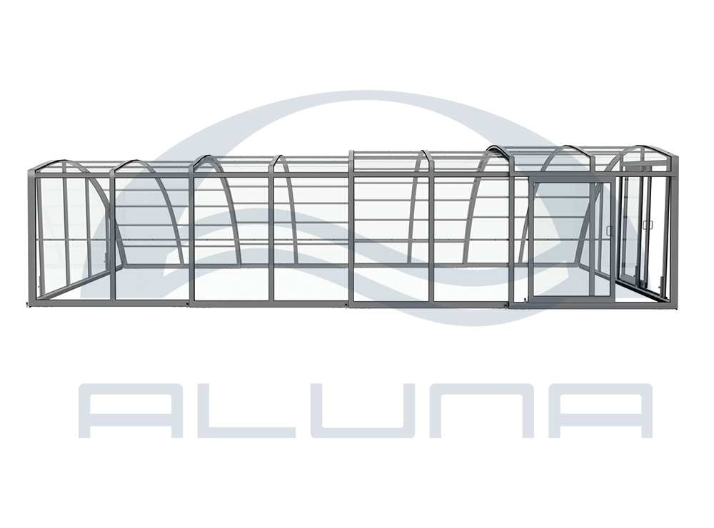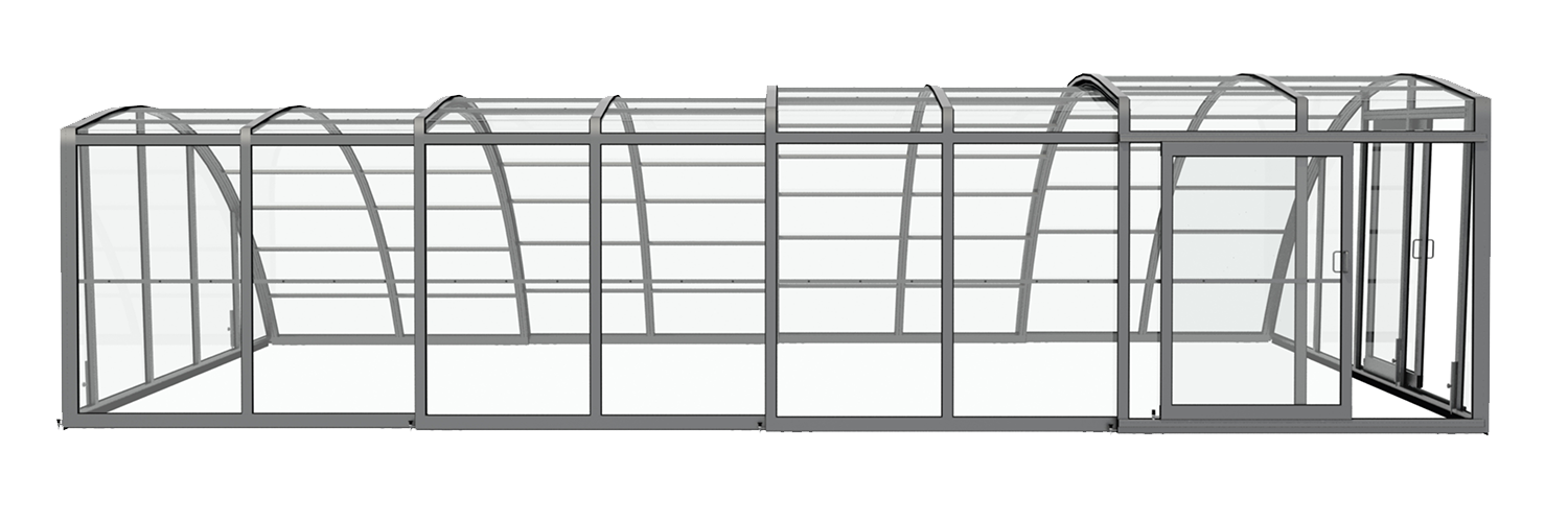 En mycket viktig del av konstruktionen är de ytterst funktionella och praktiska ingångsdörrarna, placerade i gavelväggen, som ger användaren möjlighet att gå in i poolområdet. Taket har även ett extra tillval med sidoplacerade skjutdörrar.