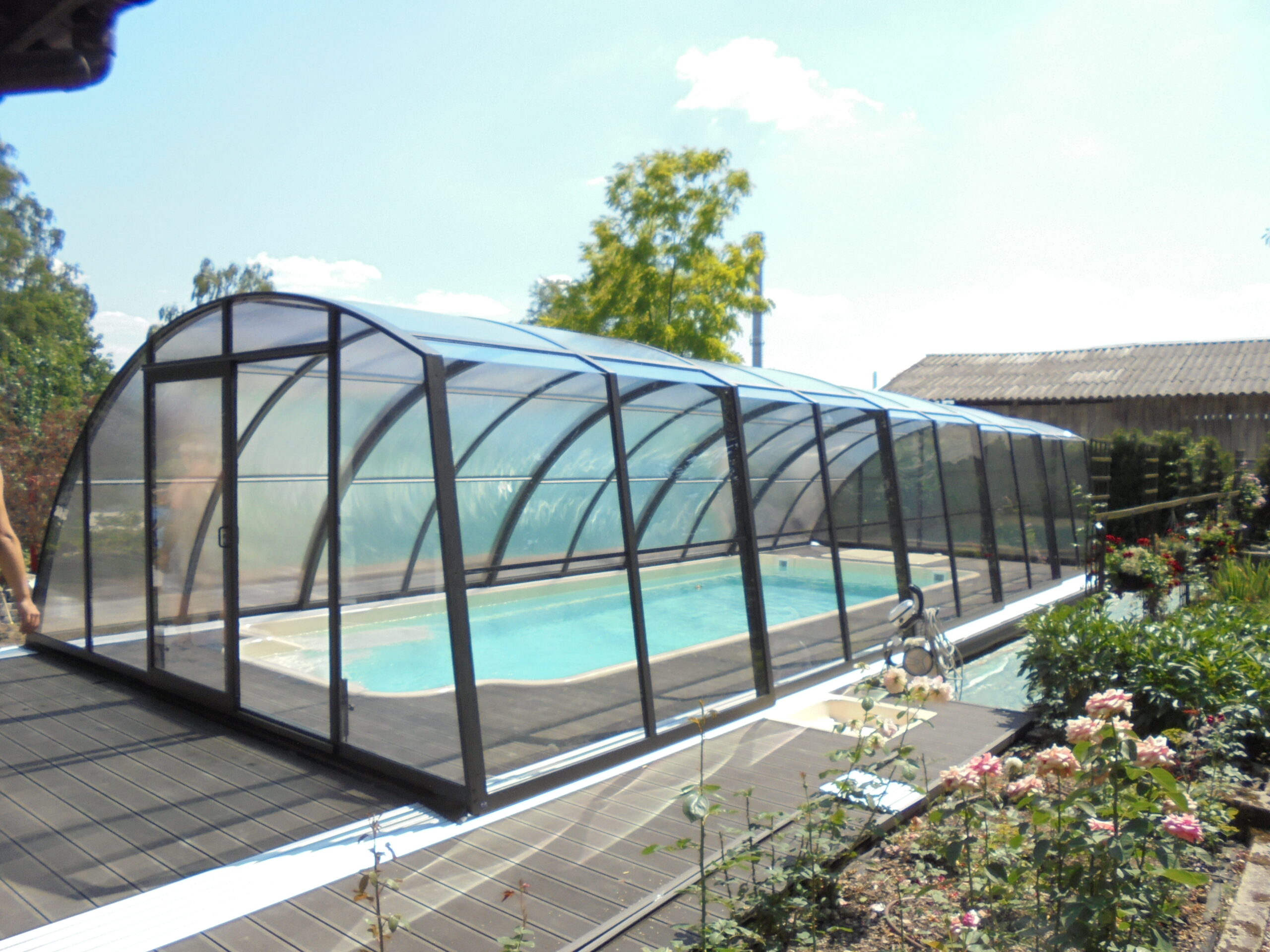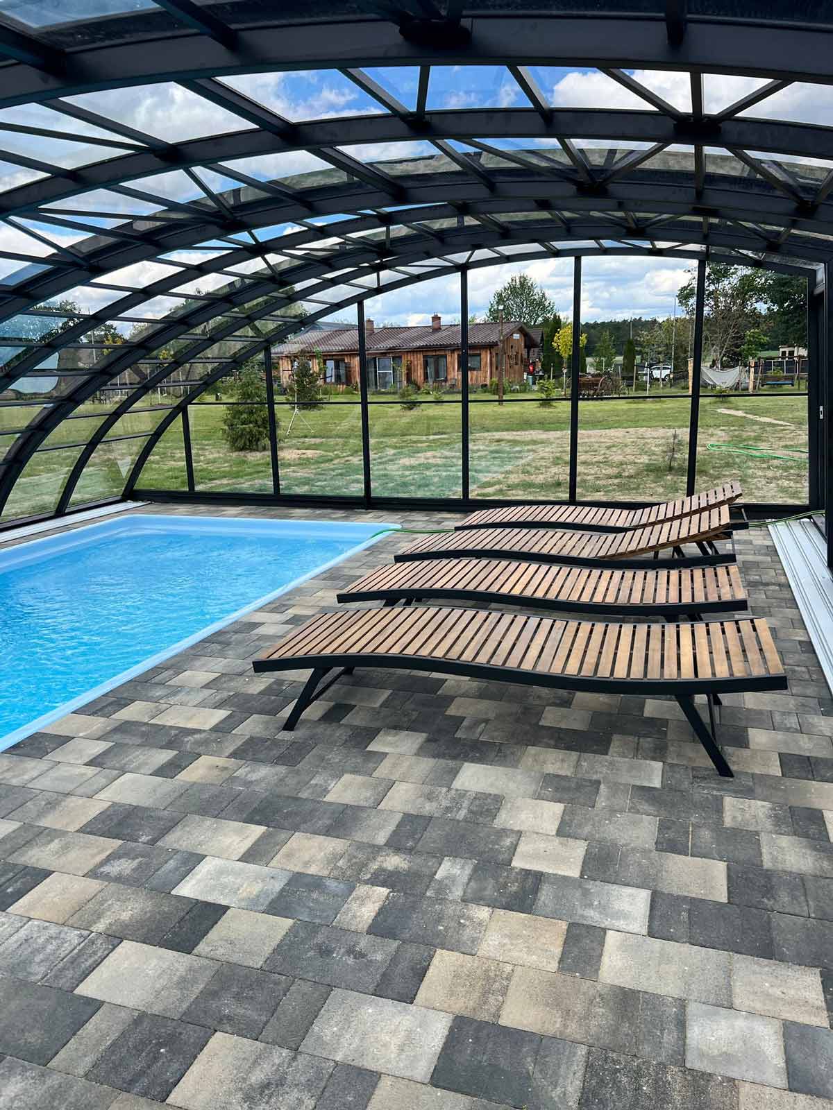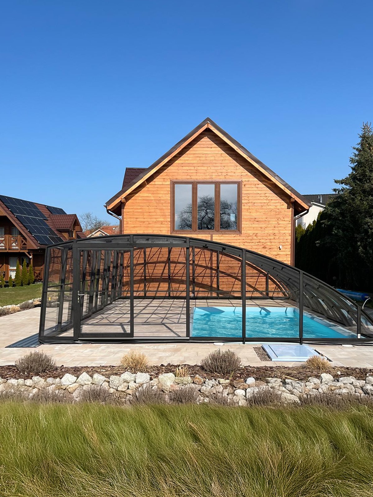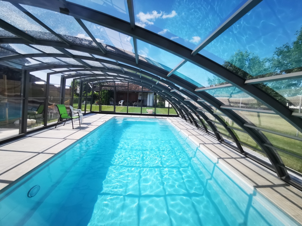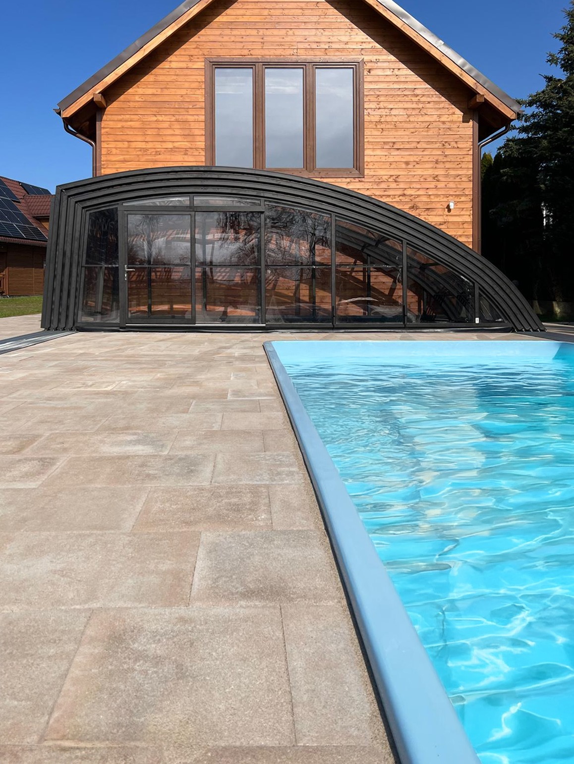 En mycket viktig del av konstruktionen är de ytterst funktionella och praktiska ingångsdörrarna, placerade i gavelväggen, som ger användaren möjlighet att gå in i poolområdet. Taket har även ett extra tillval med sidoplacerade skjutdörrar.