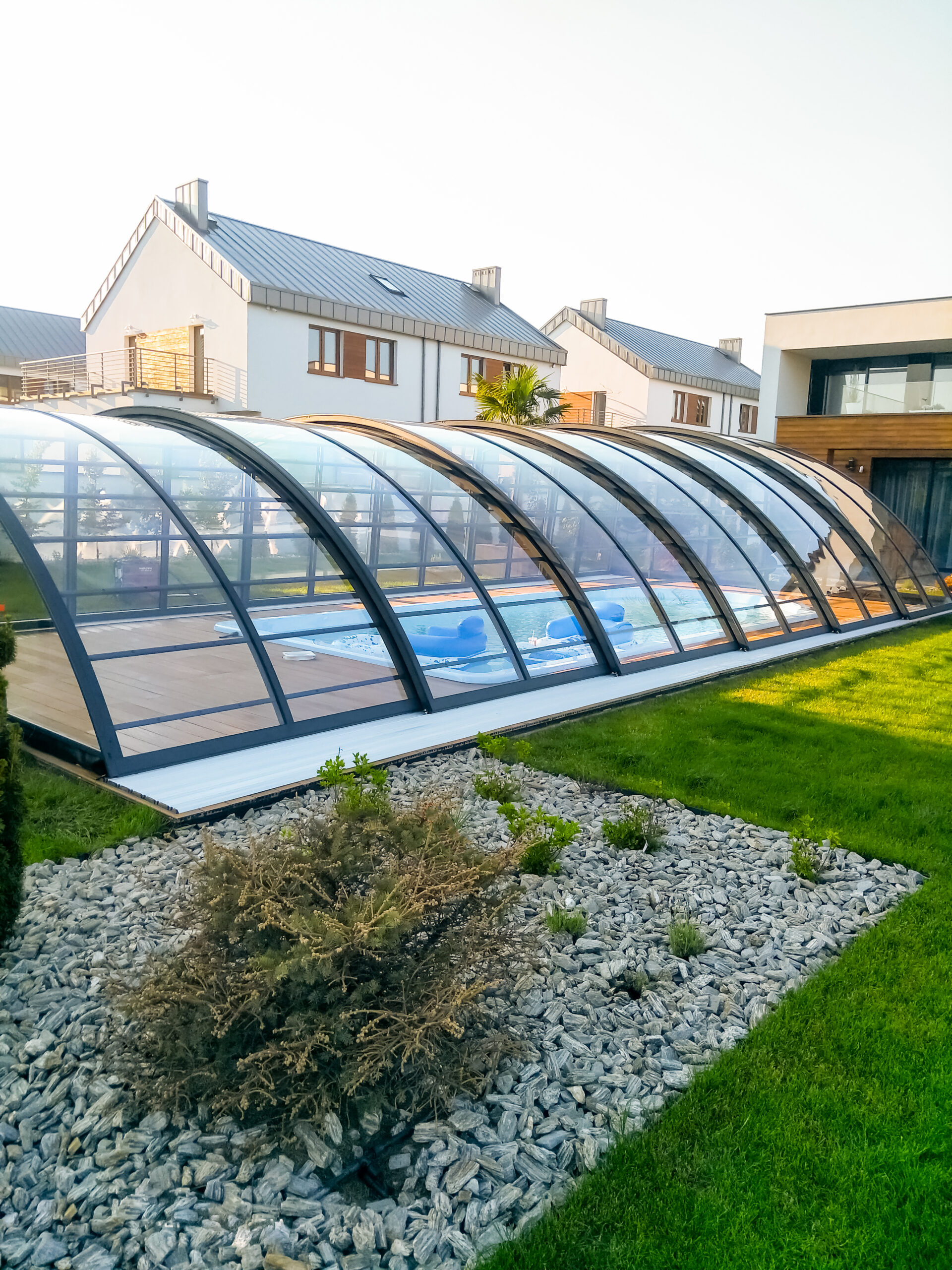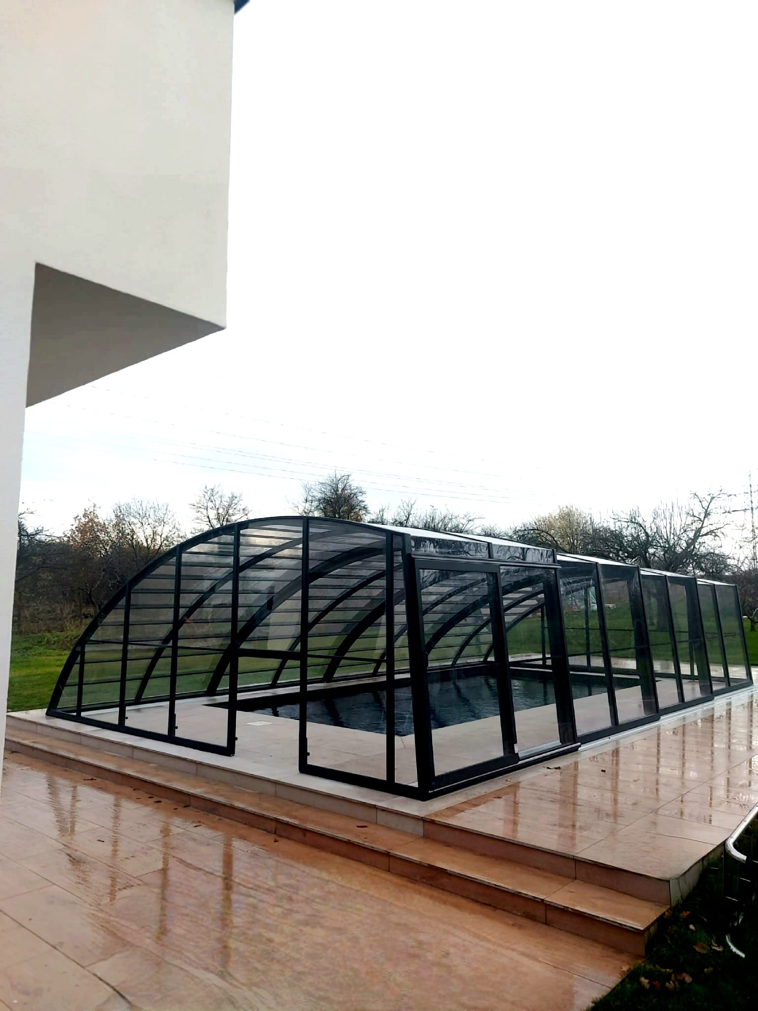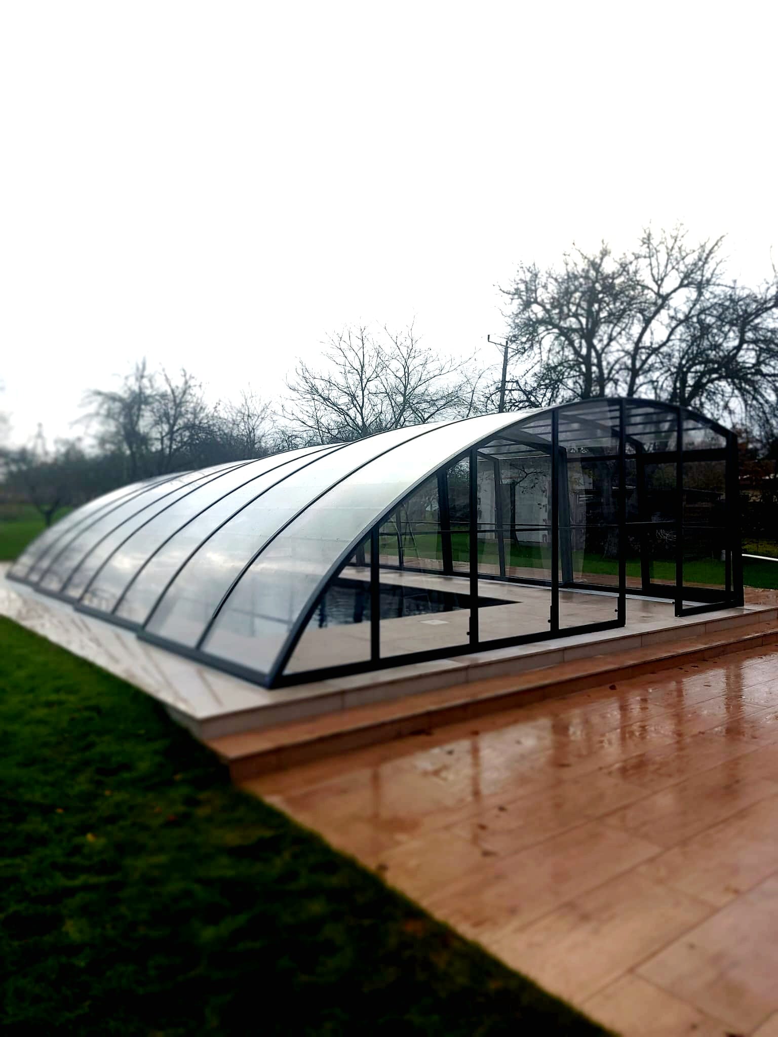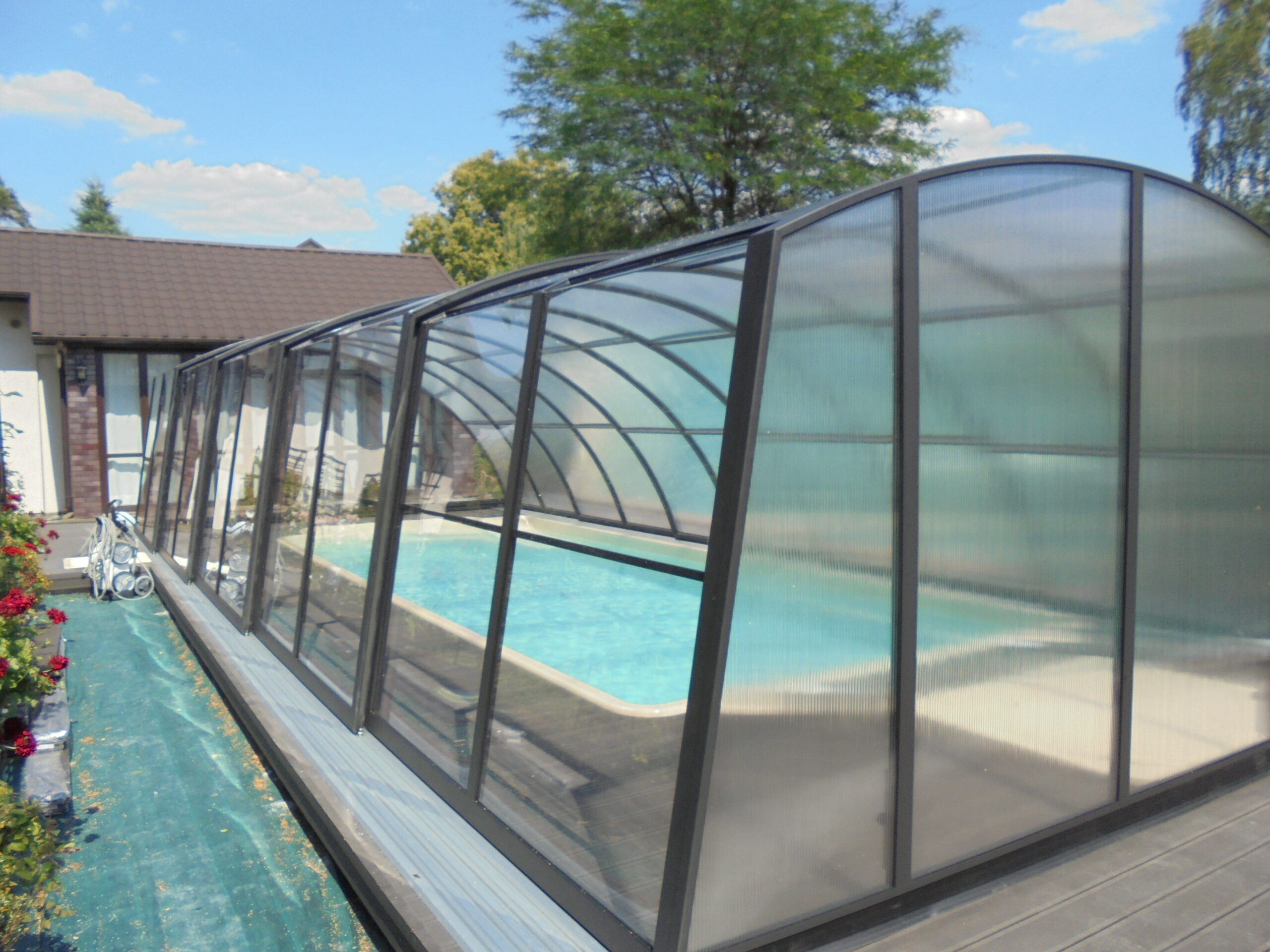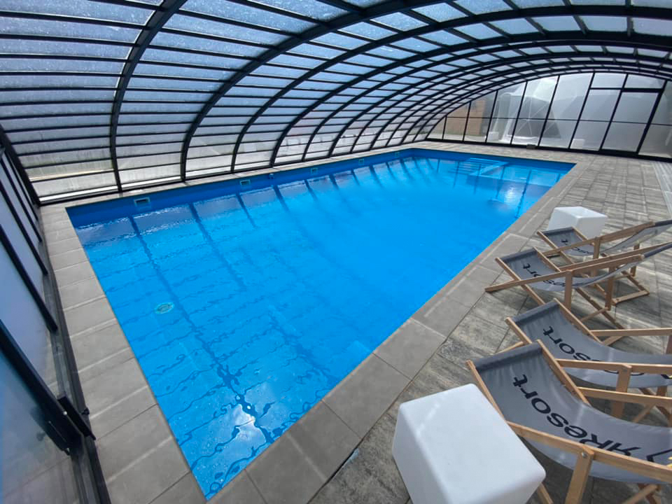En mycket viktig del av konstruktionen är de ytterst funktionella och praktiska ingångsdörrarna, placerade i gavelväggen, som ger användaren möjlighet att gå in i poolområdet. Taket har även ett extra tillval med sidoplacerade skjutdörrar.
