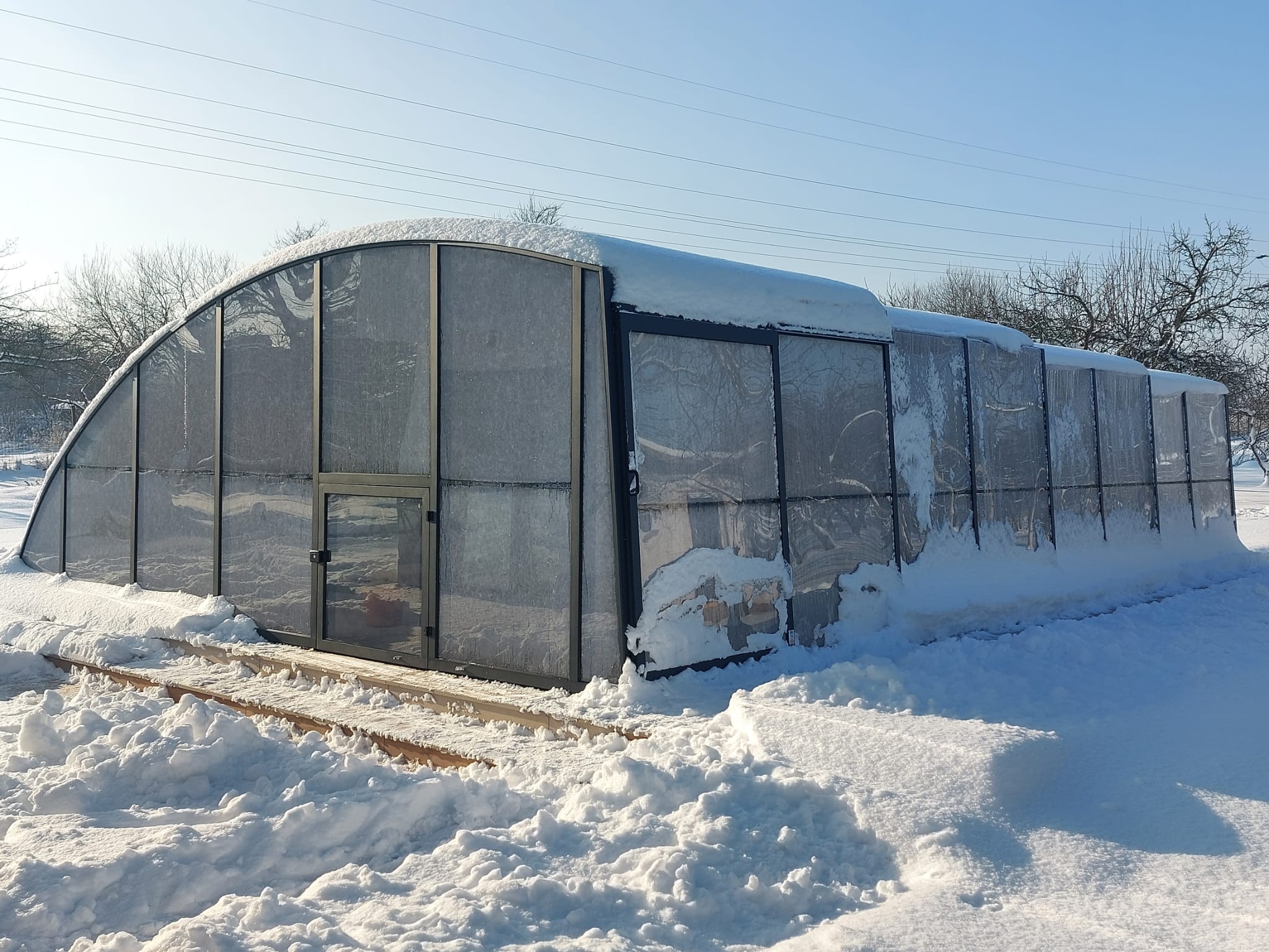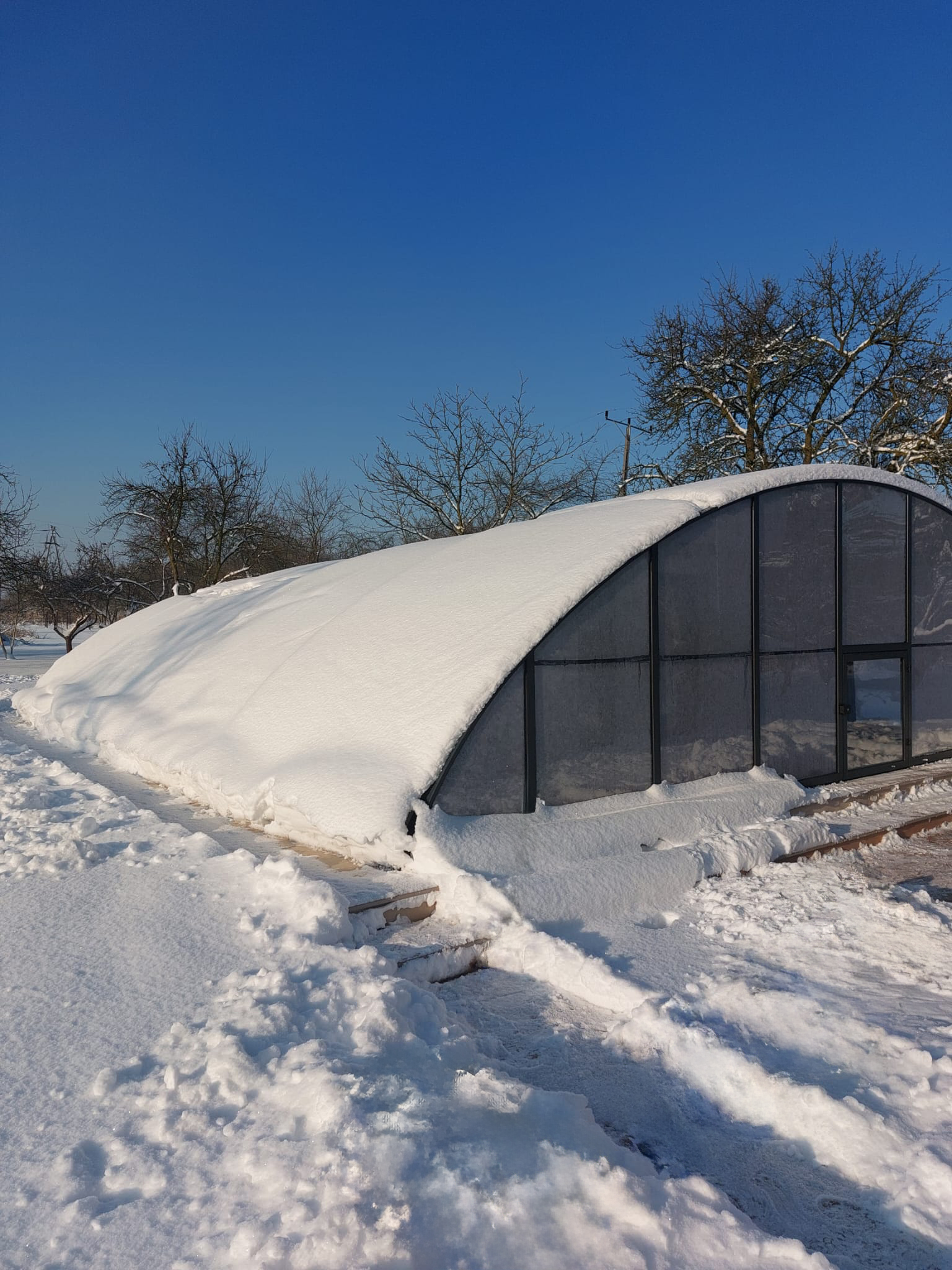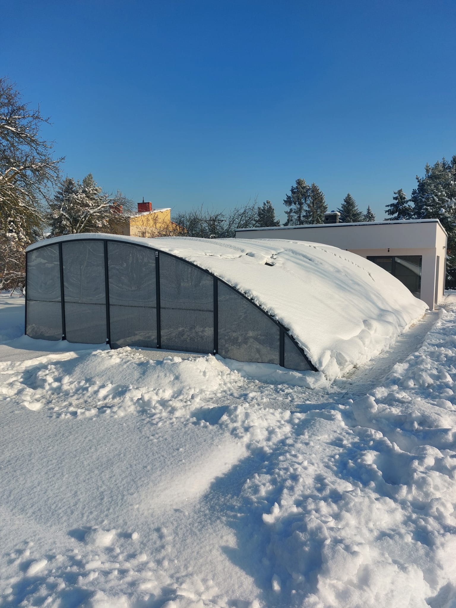 Dessutom eliminerar detta tak (genom den bågformade sidokonstruktionen) effektivt problemen med liggande snö och leder bort regnvatten på ett tillförlitligt sätt.
