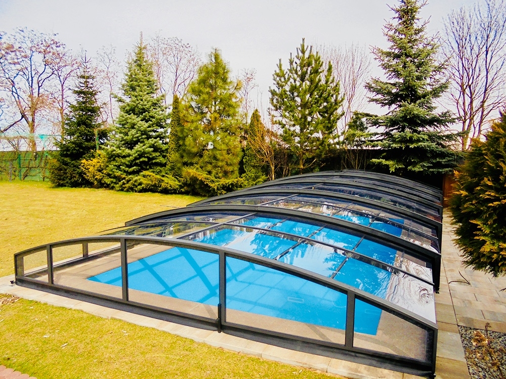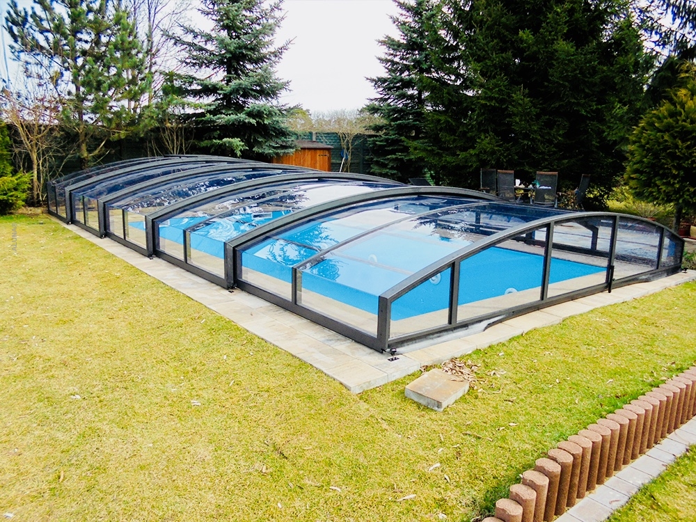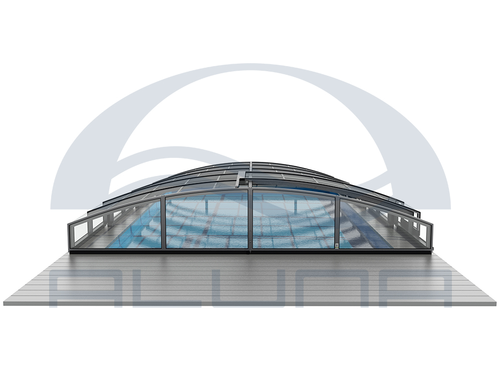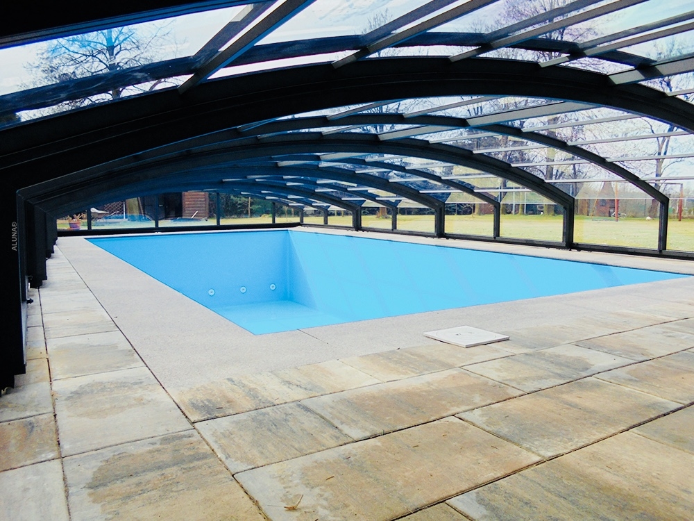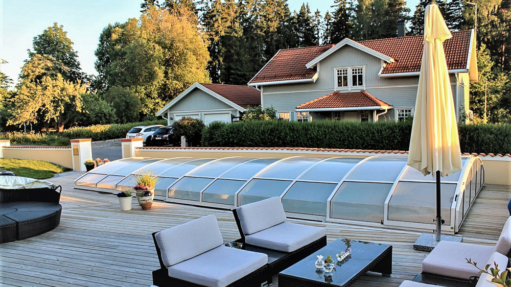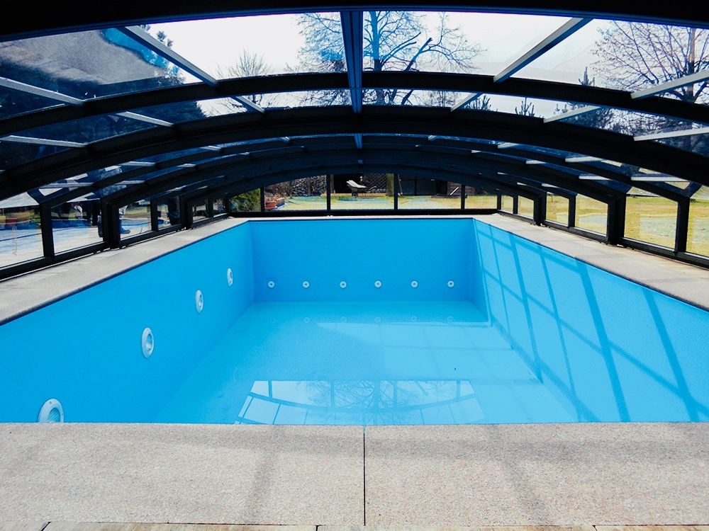 Pooltaket Aluna® Eco är ett av de lägsta taken på marknaden, uppskattat för avsaknaden av skenor och därmed möjligheten att bevara ytan runt poolen i oförändrat skick.