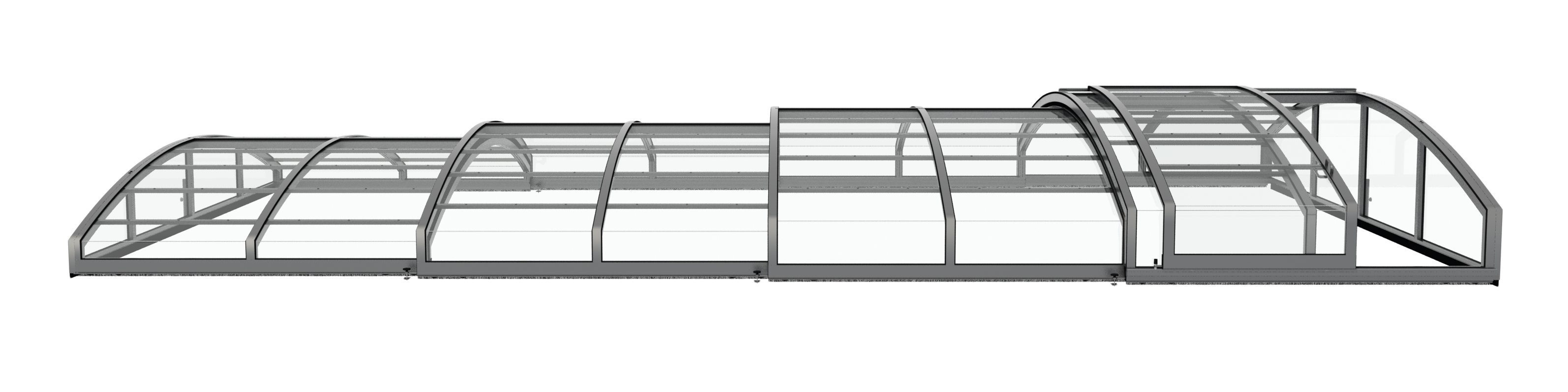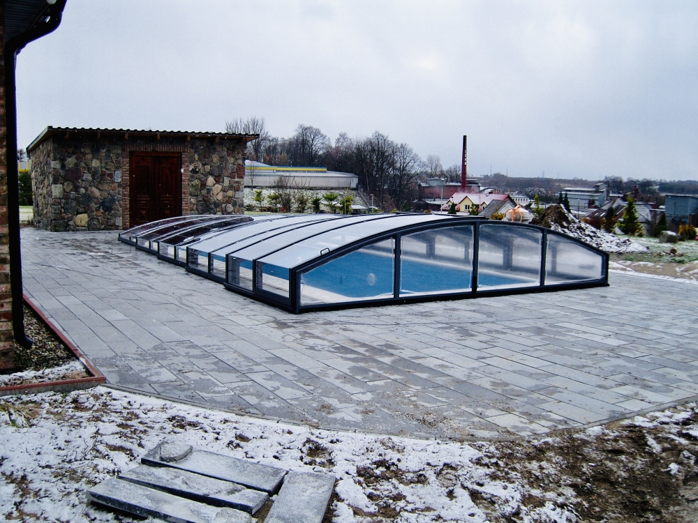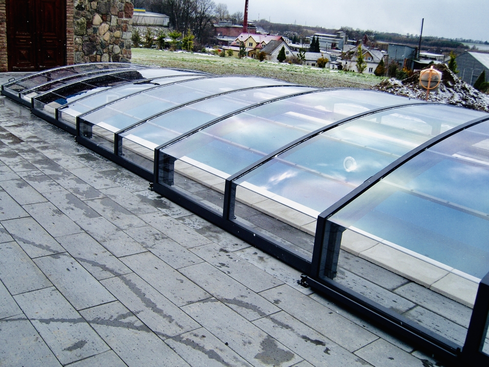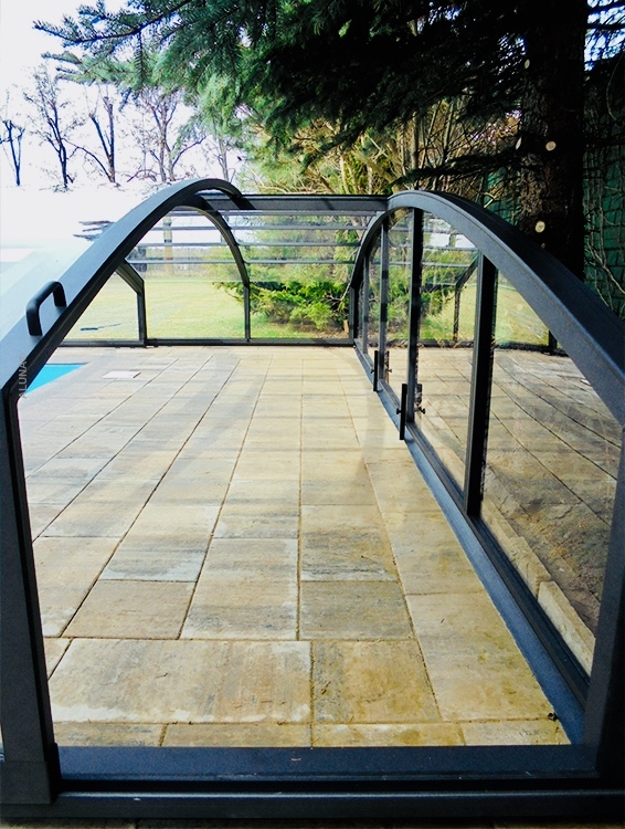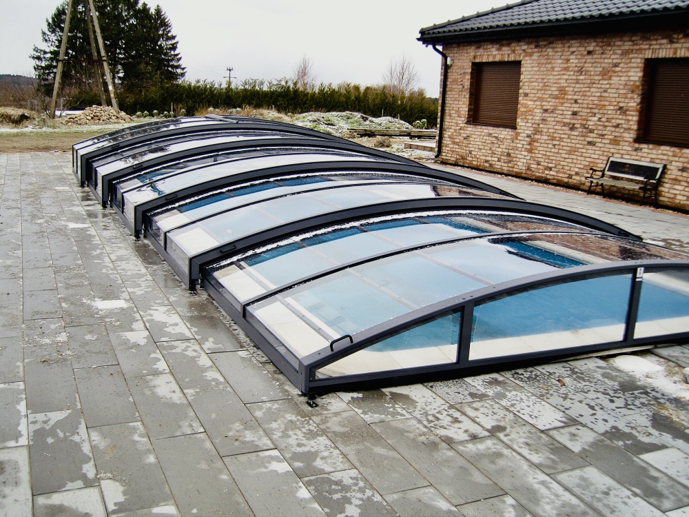 Pooltaket Aluna® Eco är ett av de lägsta taken på marknaden, uppskattat för avsaknaden av skenor och därmed möjligheten att bevara ytan runt poolen i oförändrat skick.