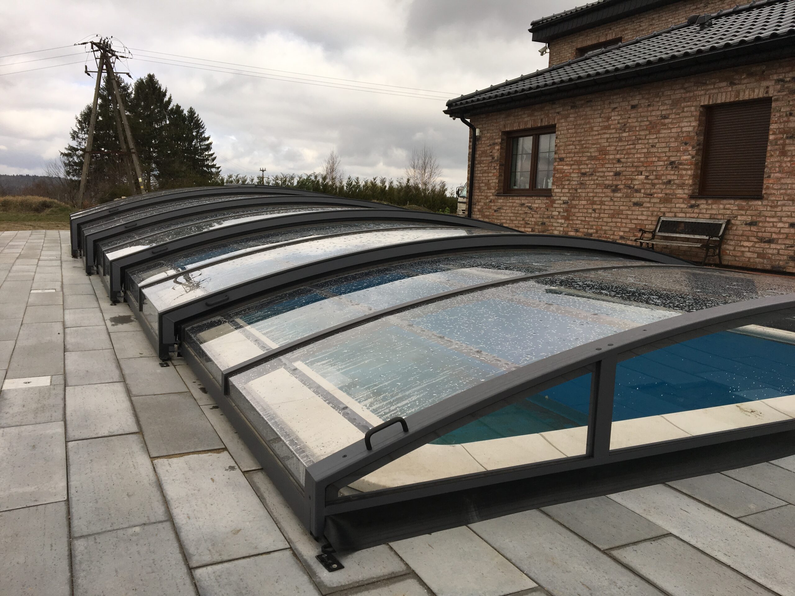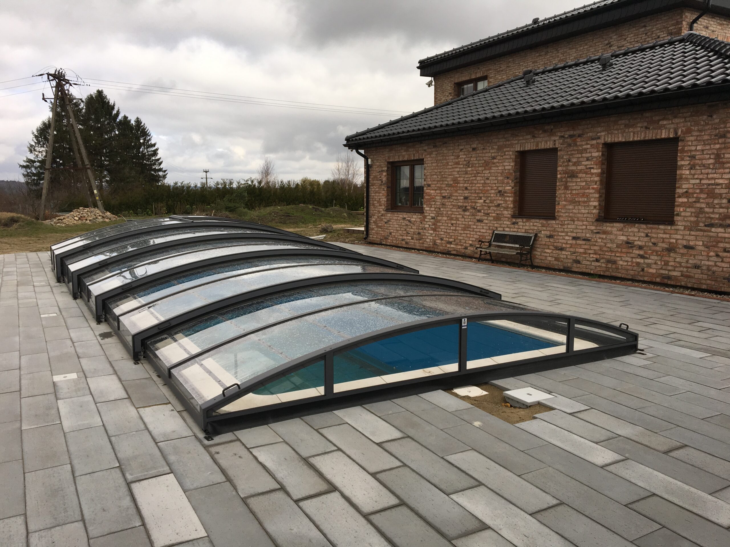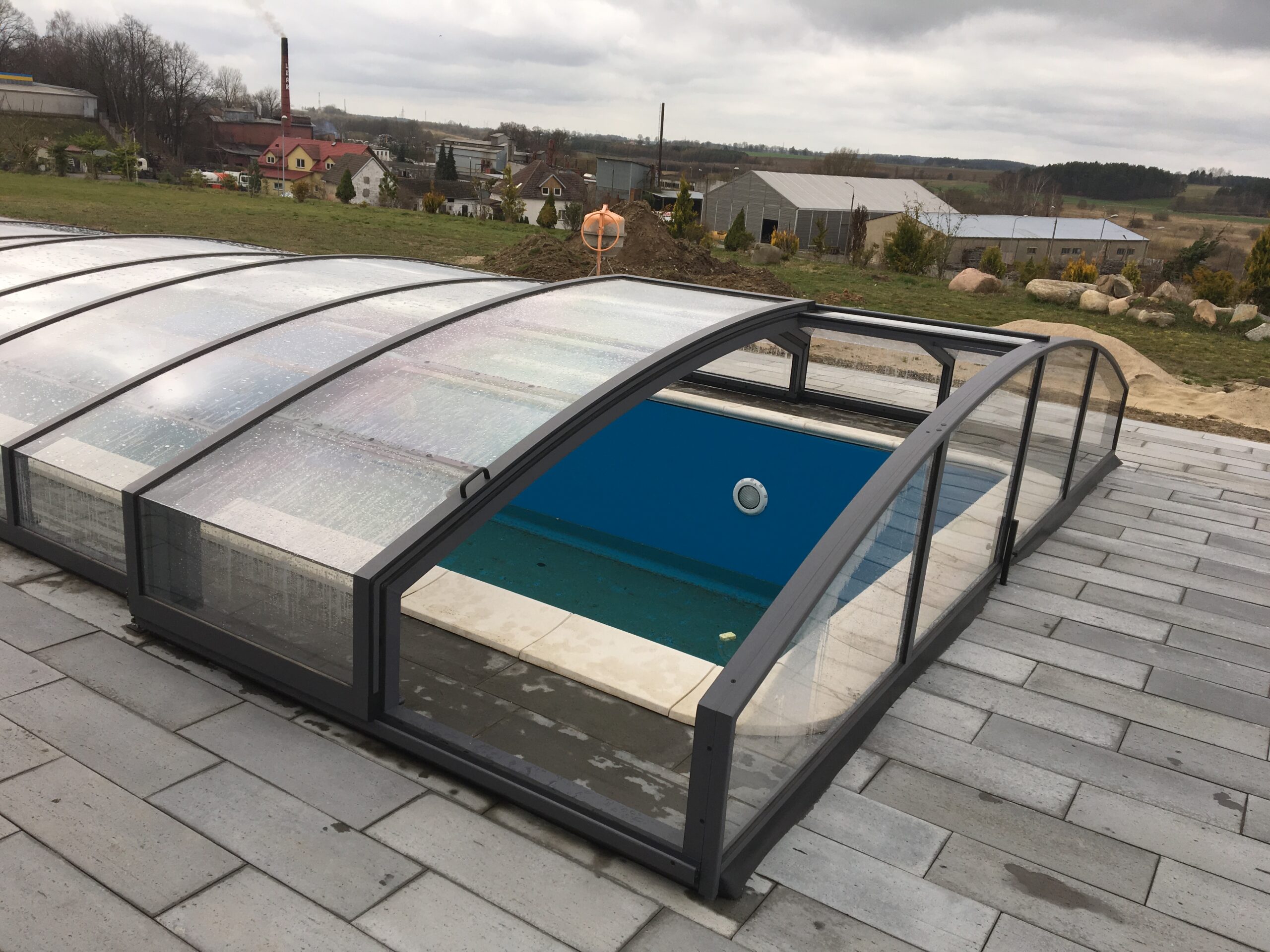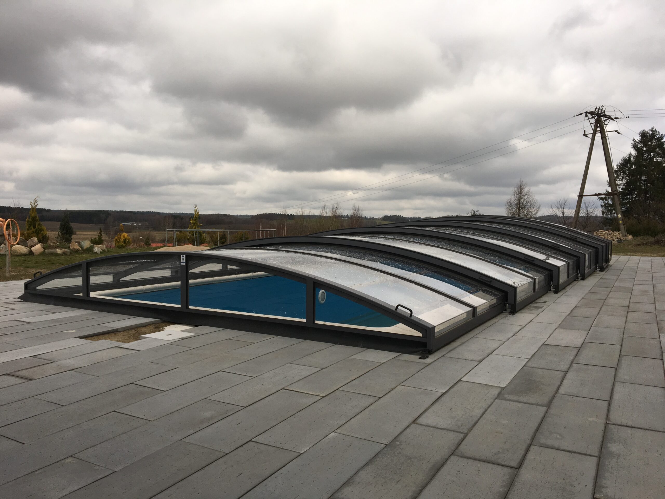 Pooltaket Aluna® Eco är ett av de lägsta taken på marknaden, uppskattat för avsaknaden av skenor och därmed möjligheten att bevara ytan runt poolen i oförändrat skick.