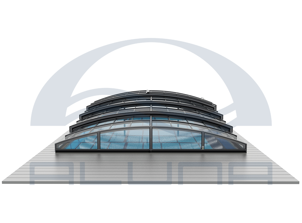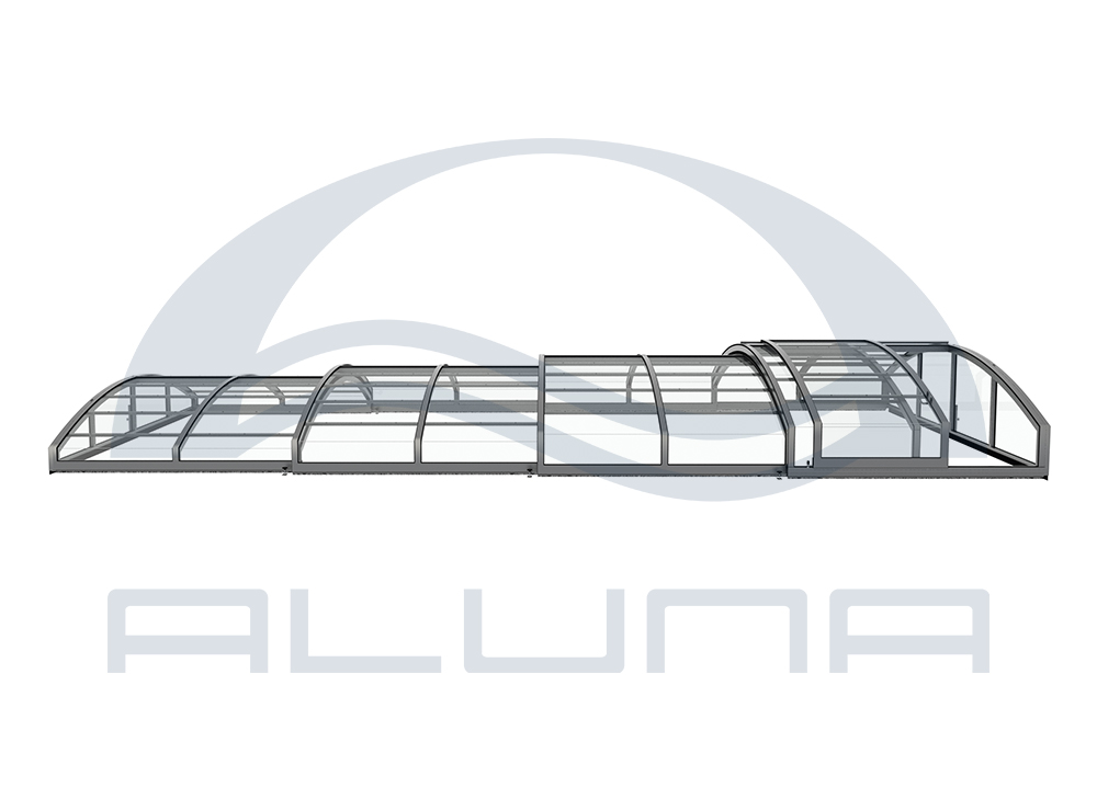 Aluna® Eco är ett lågt pooltaksystem med en intressant konstruktion utan skenor, som arbetar helt utan räls. Det är ett av de mest moderna taken bland alla Aluna®-produkter.